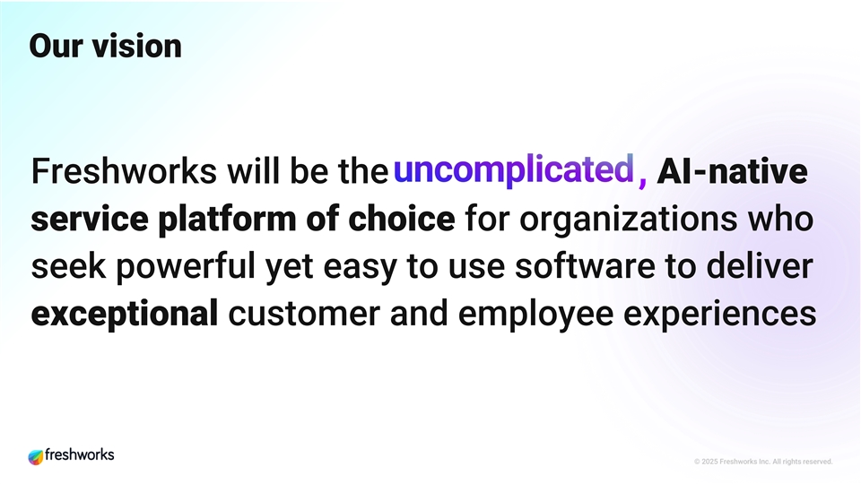 Our vision Freshworks will be the uncomplicated, AI-native service platform of choice for organizations who seek powerful yet easy to use software to deliver exceptional customer and employee experiences © 2025 Freshworks Inc. All rights reserved.