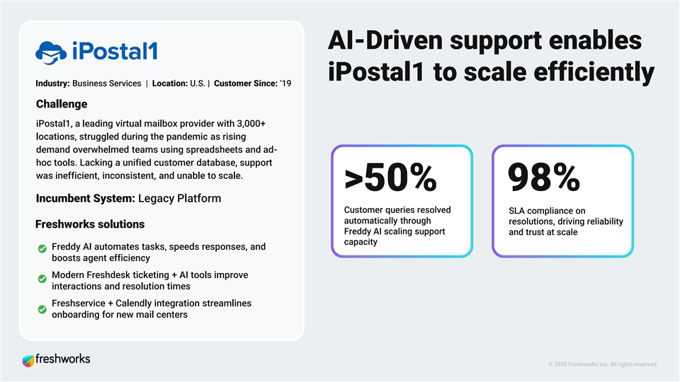 AI-Driven support enables iPostal1 to scale efficiently Industry: Business Services | Location: U.S. | Customer Since: ‘19 Challenge iPostal1, a leading virtual mailbox provider with 3,000+ locations, struggled during the pandemic as rising demand overwhelmed teams using spreadsheets and ad- hoc tools. Lacking a unified customer database, support was inefficient, inconsistent, and unable to scale. 98% >50% Incumbent System: Legacy Platform Customer queries resolved SLA compliance on automatically through resolutions, driving reliability Freshworks solutions Freddy AI scaling support and trust at scale capacity Freddy AI automates tasks, speeds responses, and boosts agent efficiency Modern Freshdesk ticketing + AI tools improve interactions and resolution times Freshservice + Calendly integration streamlines onboarding for new mail centers © 2025 Freshworks Inc. All rights reserved.