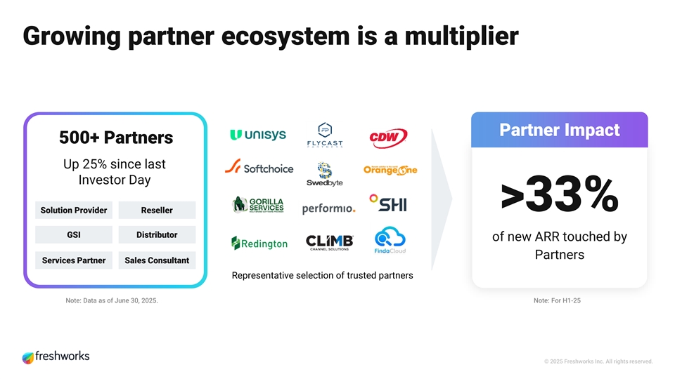 Growing partner ecosystem is a multiplier Partner Impact 500+ Partners Up 25% since last Investor Day >33% Solution Provider Reseller GSI Distributor of new ARR touched by Partners Services Partner Sales Consultant Representative selection of trusted partners Note: Data as of June 30, 2025. Note: For H1-25 © 2025 Freshworks Inc. All rights reserved.