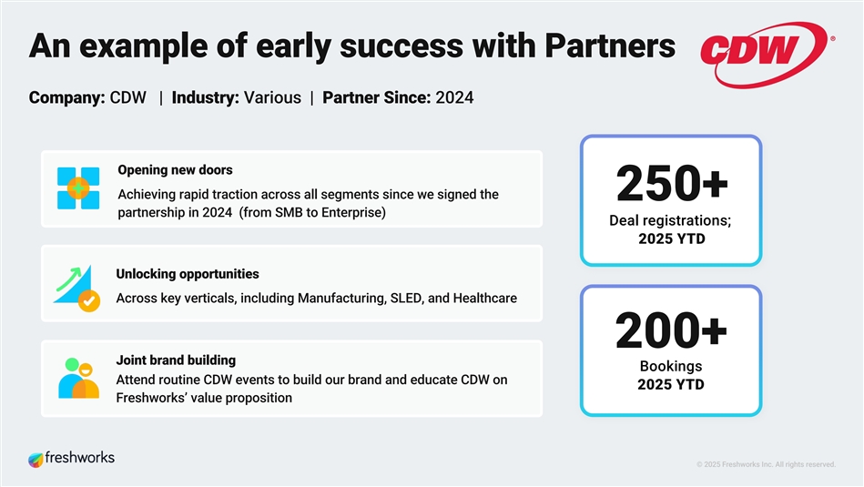 An example of early success with Partners Company: CDW | Industry: Various | Partner Since: 2024 Opening new doors Achieving rapid traction across all segments since we signed the 250+ partnership in 2024 (from SMB to Enterprise) Deal registrations; 2025 YTD Unlocking opportunities Across key verticals, including Manufacturing, SLED, and Healthcare 200+ Joint brand building Bookings Attend routine CDW events to build our brand and educate CDW on 2025 YTD Freshworks’ value proposition © 2025 Freshworks Inc. All rights reserved.