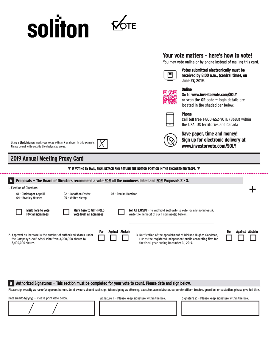 IMPORTANT NOTICE REGARDING THE AVAILABILITY OF PROXY MATERIALS FOR THE ANNUAL MEETING OF STOCKHOLDERS TO BE HELD ON JUNE 27, 2019: THE PROXY STATEMENT AND 2018 ANNUAL REPORT ARE AVAILABLE AT https://ir.soliton.com/all-sec-filings.
