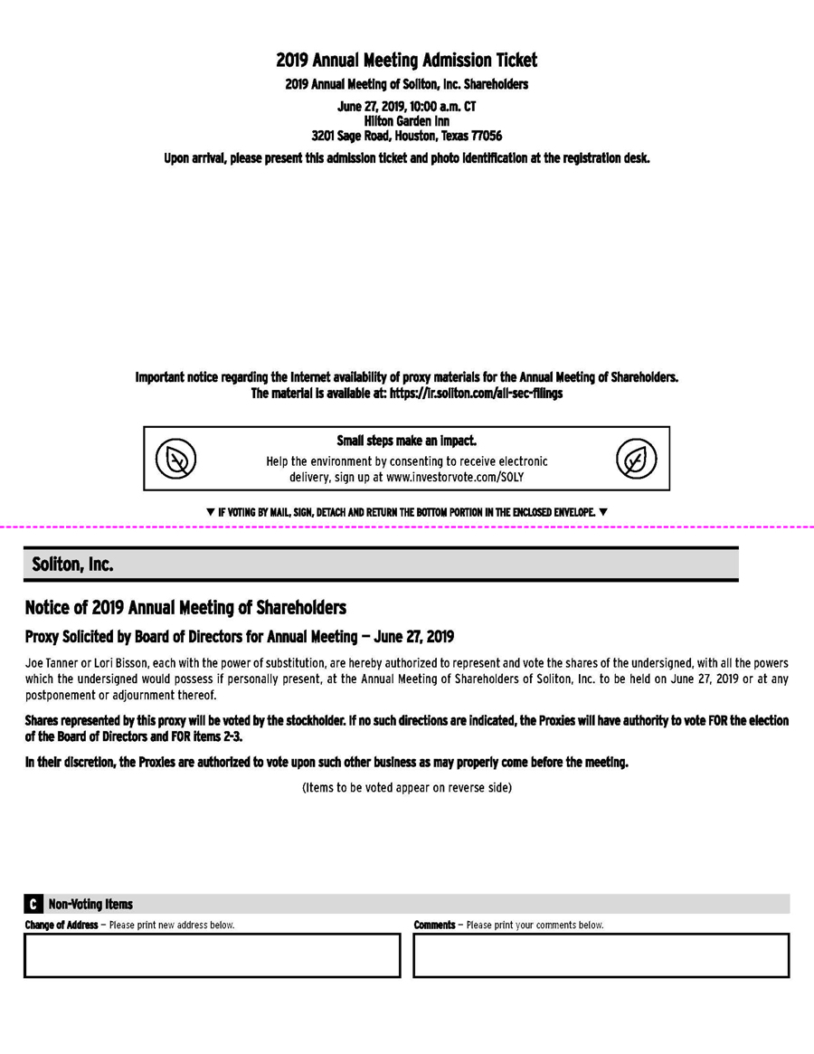 You are cordially invited to attend the 2019 Annual Meeting (the “Annual Meeting”) of the Stockholders of Soliton, Inc., a Delaware corporation (the “Company”). The Annual Meeting will be held on Thursday, June 27, 2019, commencing at 10:00 a.m. Central Time at the Hilton Garden Inn, 3201 Sage Road, Houston, TX 77056. At the Annual Meeting, we will ask our stockholders: