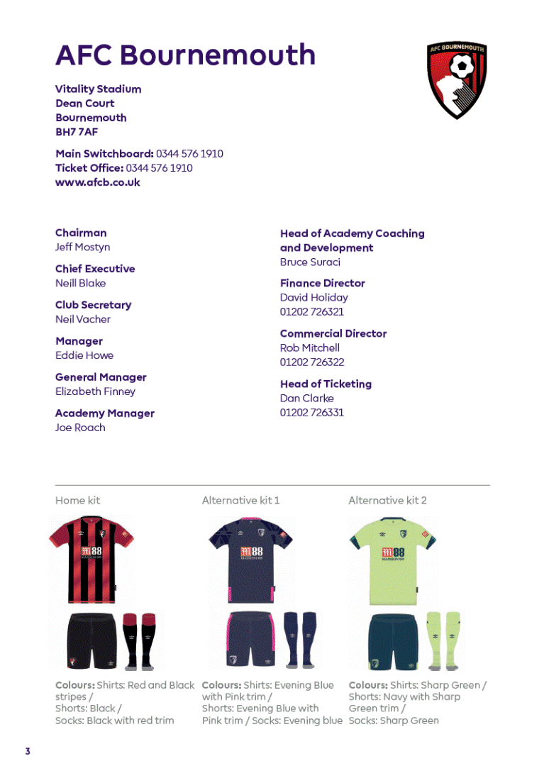 AFC Bournemouth Vitality Stadium Dean Court Bournemouth BH7 7AF Main Switchboard: 0344 576 1910 Ticket Office: 0344 576 1910 www.afcb.co.uk Chairman Jeff Mostyn Head of Academy Coaching and Development Bruce Suraci Chief Executive Neill Blake Finance Director David Holiday 01202 726321 Club Secretary Neil Vacher Manager Eddie Howe Commercial Director Rob Mitchell 01202 726322 Head of Ticketing Dan Clarke 01202 726331 General Manager Elizabeth Finney Academy Manager Joe Roach Home kit Alternative kit 1 Alternative kit 2 Colours: Shirts: Red and Black stripes / Shorts: Black / Socks: Black with red trim Colours: Shirts: Evening Blue with Pink trim / Shorts: Evening Blue with Colours: Shirts: Sharp Green / Shorts: Navy with Sharp Green trim / Pink trim / Socks: Evening blue Socks: Sharp Green 3
