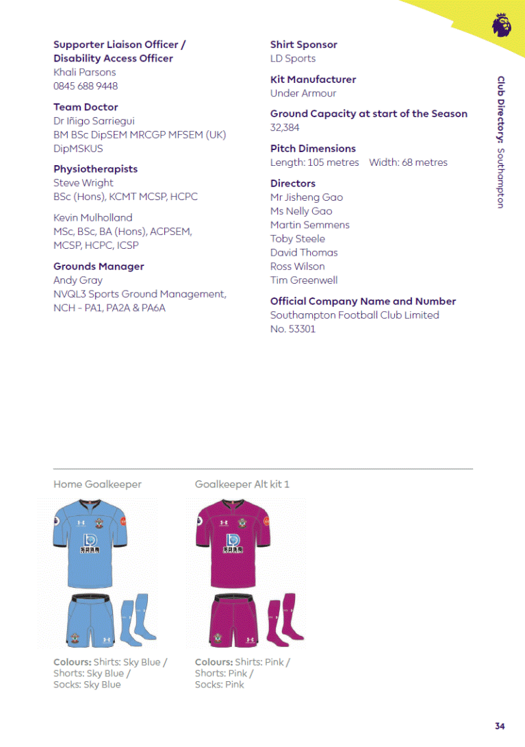 Supporter Liaison Officer / Disability Access Officer Khali Parsons 0845 688 9448 Shirt Sponsor LD Sports Kit Manufacturer Under Armour Team Doctor Dr Iñigo Sarriegui BM BSc DipSEM MRCGP MFSEM (UK) DipMSKUS Ground Capacity at start of the Season 32,384 Pitch Dimensions Length: 105 metres Width: 68 metres Directors Mr Jisheng Gao Ms Nelly Gao Martin Semmens Toby Steele David Thomas Ross Wilson Tim Greenwell Physiotherapists Steve Wright BSc (Hons), KCMT MCSP, HCPC Kevin Mulholland MSc, BSc, BA (Hons), ACPSEM, MCSP, HCPC, ICSP Grounds Manager Andy Gray NVQL3 Sports Ground Management, NCH - PA1, PA2A & PA6A Official Company Name and Number Southampton Football Club Limited No. 53301 Home Goalkeeper Goalkeeper Alt kit 1 Colours: Shirts: Sky Blue / Shorts: Sky Blue / Socks: Sky Blue Colours: Shirts: Pink / Shorts: Pink / Socks: Pink 34 Club Directory: Southampton
