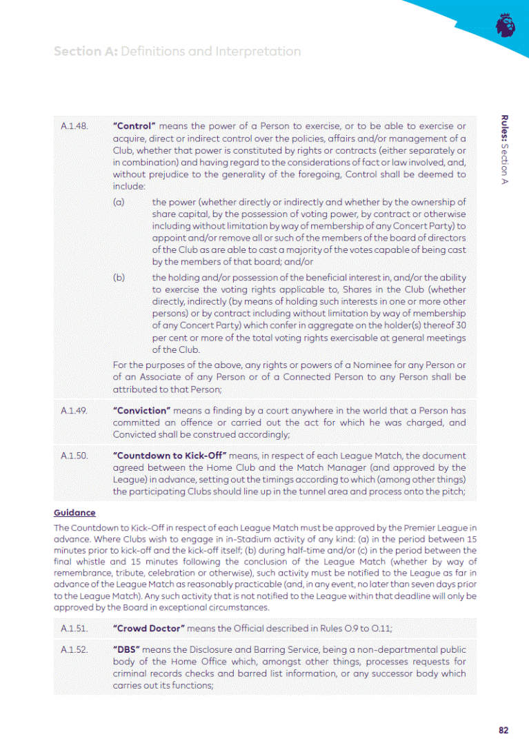 Section A: Definitions and Interpretation Guidance The Countdown to Kick-Off in respect of each League Match must be approved by the Premier League in advance. Where Clubs wish to engage in in-Stadium activity of any kind: (a) in the period between 15 minutes prior to kick-off and the kick-off itself; (b) during half-time and/or (c) in the period between the final whistle and 15 minutes following the conclusion of the League Match (whether by way of remembrance, tribute, celebration or otherwise), such activity must be notified to the League as far in advance of the League Match as reasonably practicable (and, in any event, no later than seven days prior to the League Match). Any such activity that is not notified to the League within that deadline will only be approved by the Board in exceptional circumstances. 82 Rules: Section A A.1.51.“Crowd Doctor” means the Official described in Rules O.9 to O.11; A.1.52. “DBS” means the Disclosure and Barring Service, being a non-departmental public body of the Home Office which, amongst other things, processes requests for criminal records checks and barred list information, or any successor body which carries out its functions; A.1.48. “Control” means the power of a Person to exercise, or to be able to exercise or acquire, direct or indirect control over the policies, affairs and/or management of a Club, whether that power is constituted by rights or contracts (either separately or in combination) and having regard to the considerations of fact or law involved, and, without prejudice to the generality of the foregoing, Control shall be deemed to include: (a) the power (whether directly or indirectly and whether by the ownership of share capital, by the possession of voting power, by contract or otherwise including without limitation by way of membership of any Concert Party) to appoint and/or remove all or such of the members of the board of directors of the Club as are able to cast a majority of the votes capable of being cast by the members of that board; and/or (b) the holding and/or possession of the beneficial interest in, and/or the ability to exercise the voting rights applicable to, Shares in the Club (whether directly, indirectly (by means of holding such interests in one or more other persons) or by contract including without limitation by way of membership of any Concert Party) which confer in aggregate on the holder(s) thereof 30 per cent or more of the total voting rights exercisable at general meetings of the Club. For the purposes of the above, any rights or powers of a Nominee for any Person or of an Associate of any Person or of a Connected Person to any Person shall be attributed to that Person; A.1.49. “Conviction” means a finding by a court anywhere in the world that a Person has committed an offence or carried out the act for which he was charged, and Convicted shall be construed accordingly; A.1.50. “Countdown to Kick-Off” means, in respect of each League Match, the document agreed between the Home Club and the Match Manager (and approved by the League) in advance, setting out the timings according to which (among other things) the participating Clubs should line up in the tunnel area and process onto the pitch;
