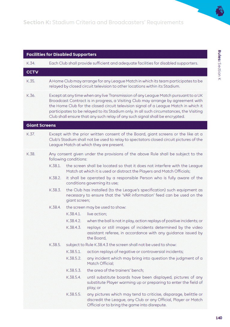 Contents All Seater Grounds Ground Regulations Covered Stadia Dressing Rooms Drug-testing Room Security The Pitch Pitch Protection Artificial Surfaces Goal Line Technology and Video Assistant Refereeing Trainers’ Bench Facilities Technical Areas Sanitary Facilities Facilities for Disabled Supporters CCTV Giant Screens Media Facilities – General Television Gantry UK TV Commentary Positions International TV Commentary Positions Radio Commentary Positions TV Broadcasters’ Pitchside Presentation Positions Tunnel Interview Positions Camera Positions: Match Coverage Camera Positions: Team and Supporter Arrivals Television Studios TV Broadcasters: Observer Seats Reporter, Floor Manager and Match Manager Positions Visiting Club Analyst Positions Mixed Zone Access to Tunnel Interview Positions Hardwiring Transmission of Pre-Match Media Conference Power Supply Car Park Spaces Outside Broadcast Compound Official Club Team Sheets Media Working Area Media Conference Room Press Seats Facilities for Photographers 136 136 136 136 136 136 137 138 138 138 139 139 139 140 140 140 141 143 143 144 144 145 145 146 146 147 147 147 148 148 149 150 150 150 150 151 151 152 152 152 153 65
