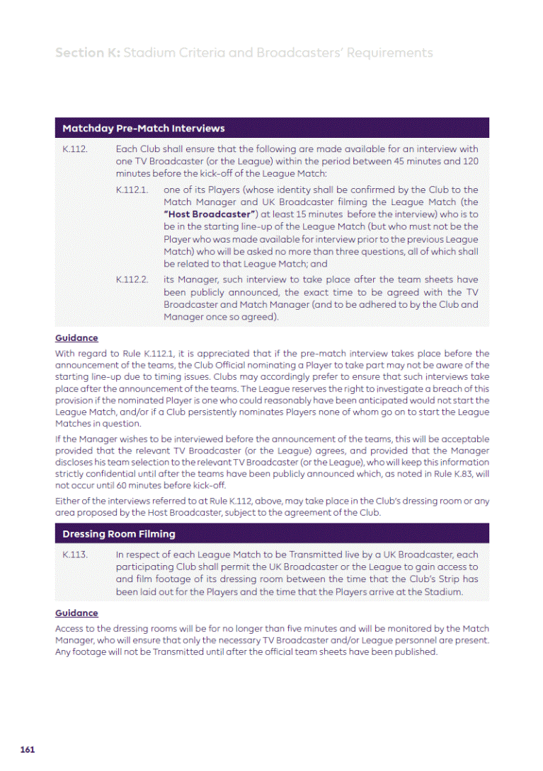Section A: Definitions and Interpretation Guidance The appointment of a Match Manager in relation to a League Match does not absolve Clubs from compliance with their responsibilities under Rules L.29 and L.30 (which provide for prompt kick-offs and re-starts of League Matches) or with any of the provisions of Section K concerning Broadcaster access requirements. 87 A.1.114.“Match Officials” means referees, assistant referees, video assistant referees and assistant video assistant referees and includes reserve officials and fourth officials; A.1.115.“Material Transactions” has the meaning set out in Rule H.1; A.1.116.“Medical Coordinator” means the Official described in Rule O.7; A.1.106. “Licensing Manual” means the manual in which are set out procedures agreed between The Football Association and the League relating to applications for and the granting of licences enabling Clubs (or clubs) to play in UEFA Club Competitions; A.1.107.“Loan Fee” means any sum of money (exclusive of value added tax) payable by a Transferee Club to a Transferor Club upon a Temporary Transfer; A.1.108.“Manager” means the Official of a Club responsible for selecting the Club’s first team; A.1.109.“Managers’ Arbitration Tribunal” has the meaning set out in Rule Y.1; A.1.110.“Mandatory Medical Equipment Form” means the document referred to Rule O.8, in such form as prescribed by the Board from time to time; A.1.111. “Match Day Information Sheet” means, in respect of each League Match, the administrative document produced by the League and distributed to the Home Club and Visiting Club in advance, containing relevant information for match day operations including (but not limited to) approved Strips, the identity of the relevant Match Officials, the Countdown to Kick-Off and the identities and contact details of the Match Manager and other League representatives; A.1.112.“Match Day Medical Requirements Form” means the document referred to Rule O.7, in such form as prescribed by the Board from time to time; A.1.113. “Match Manager” means a representative of the League who may be appointed to act in relation to a League Match and whose responsibilities include (without limitation): (a) liaising with Clubs, Match Officials, Broadcasters and any Person with whom the League has entered into a Commercial Contract to promote the delivery by the League of all match day requirements and entitlements of Broadcasters and such Persons pursuant to these Rules; (b) assisting Clubs to comply with their obligations pursuant to Rule D.3 insofar as those obligations must be fulfilled at League Matches; and (c) working with Clubs and Broadcasters to enable the referee to ensure that the kick-off, and re-start after half-time, of each League Match take place promptly;