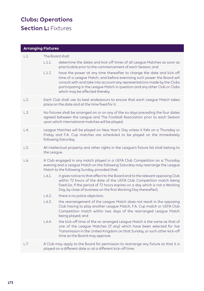 Contents Content Sessions UK Content Sessions International Content Sessions Additional League Content Sessions Pre-Match Media Conference Pre-Match Filming Interviews - General Matchday Pre-Match Interviews Dressing Room Filming Half-time Interviews Post-Match Interviews, Mixed Zone and Post-Match Media Conference League Champions Promotional Photographs and Footage Pre-Season Content Session Floodlights Fixtures Arranging Fixtures Arranging Other Matches Other Competitions Postponement of League Matches Failure to Play a League Match Replaying a League Match Match Delegate Full Strength Teams Minimum Age Team Sheet and Pre-Match Briefing Substitute Players Kick-Off Countdown to Kick-Off Use of Official Ball Occupation of the Technical Area Duration of League Matches Gate Statements Penalties Compensation for Postponed Matches Provision of Hospitality for Officials Players’ Identification and Strip Player Identification Home and Alternative Strips Strip Advertising 153 154 156 158 159 160 160 161 161 162 162 166 166 167 168 173 173 174 174 174 175 175 175 175 175 175 176 176 177 177 177 177 177 177 178 178 179 179 179 182 Section L: Section M: 66 Rules Index