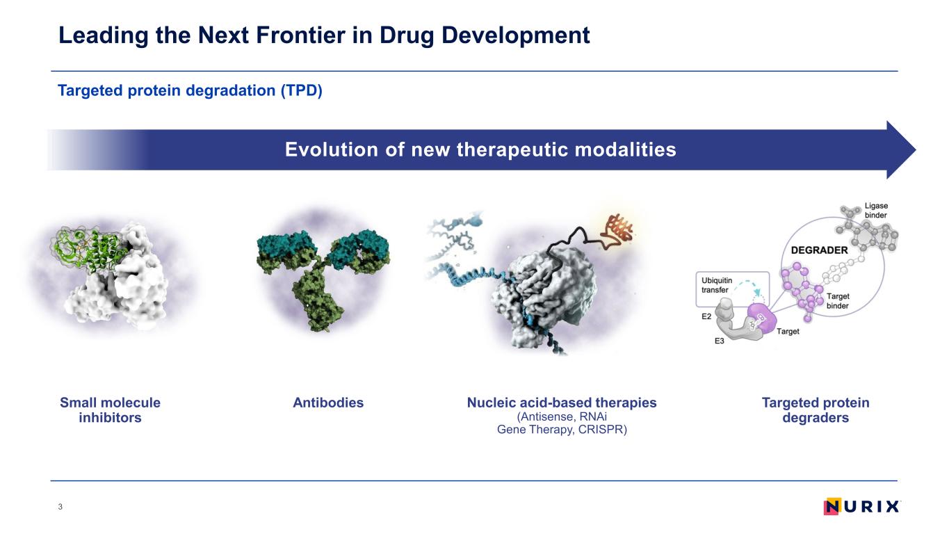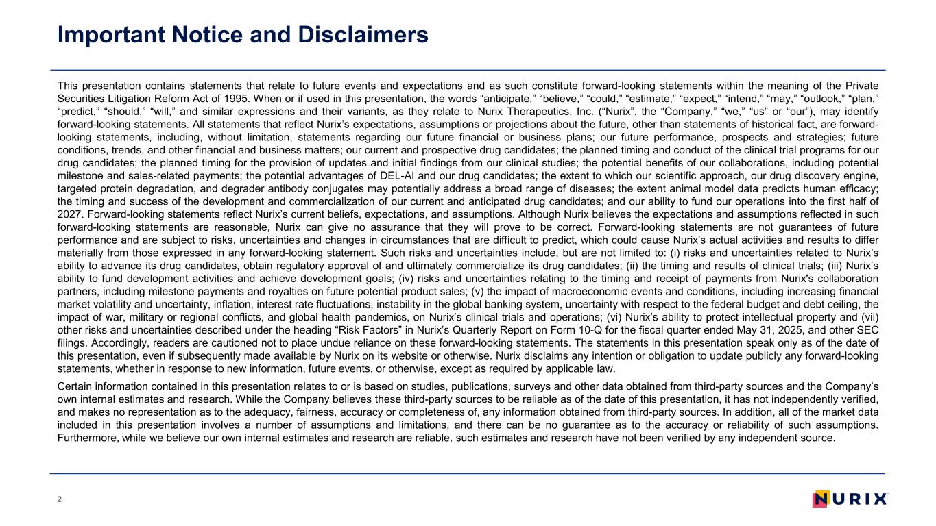 Important Notice and Disclaimers This presentation contains statements that relate to future events and expectations and as such constitute forward-looking statements within the meaning of the Private Securities Litigation Reform Act of 1995. When or if used in this presentation, the words “anticipate,” “believe,” “could,” “estimate,” “expect,” “intend,” “may,” “outlook,” “plan,” “predict,” “should,” “will,” and similar expressions and their variants, as they relate to Nurix Therapeutics, Inc. (“Nurix”, the “Company,” “we,” “us” or “our”), may identify forward-looking statements. All statements that reflect Nurix’s expectations, assumptions or projections about the future, other than statements of historical fact, are forward- looking statements, including, without limitation, statements regarding our future financial or business plans; our future performance, prospects and strategies; future conditions, trends, and other financial and business matters; our current and prospective drug candidates; the planned timing and conduct of the clinical trial programs for our drug candidates; the planned timing for the provision of updates and initial findings from our clinical studies; the potential benefits of our collaborations, including potential milestone and sales-related payments; the potential advantages of DEL-AI and our drug candidates; the extent to which our scientific approach, our drug discovery engine, targeted protein degradation, and degrader antibody conjugates may potentially address a broad range of diseases; the extent animal model data predicts human efficacy; the timing and success of the development and commercialization of our current and anticipated drug candidates; and our ability to fund our operations into the first half of 2027. Forward-looking statements reflect Nurix’s current beliefs, expectations, and assumptions. Although Nurix believes the expectations and assumptions reflected in such forward-looking statements are reasonable, Nurix can give no assurance that they will prove to be correct. Forward-looking statements are not guarantees of future performance and are subject to risks, uncertainties and changes in circumstances that are difficult to predict, which could cause Nurix’s actual activities and results to differ materially from those expressed in any forward-looking statement. Such risks and uncertainties include, but are not limited to: (i) risks and uncertainties related to Nurix’s ability to advance its drug candidates, obtain regulatory approval of and ultimately commercialize its drug candidates; (ii) the timing and results of clinical trials; (iii) Nurix’s ability to fund development activities and achieve development goals; (iv) risks and uncertainties relating to the timing and receipt of payments from Nurix's collaboration partners, including milestone payments and royalties on future potential product sales; (v) the impact of macroeconomic events and conditions, including increasing financial market volatility and uncertainty, inflation, interest rate fluctuations, instability in the global banking system, uncertainty with respect to the federal budget and debt ceiling, the impact of war, military or regional conflicts, and global health pandemics, on Nurix’s clinical trials and operations; (vi) Nurix’s ability to protect intellectual property and (vii) other risks and uncertainties described under the heading “Risk Factors” in Nurix’s Quarterly Report on Form 10-Q for the fiscal quarter ended May 31, 2025, and other SEC filings. Accordingly, readers are cautioned not to place undue reliance on these forward-looking statements. The statements in this presentation speak only as of the date of this presentation, even if subsequently made available by Nurix on its website or otherwise. Nurix disclaims any intention or obligation to update publicly any forward-looking statements, whether in response to new information, future events, or otherwise, except as required by applicable law. Certain information contained in this presentation relates to or is based on studies, publications, surveys and other data obtained from third-party sources and the Company’s own internal estimates and research. While the Company believes these third-party sources to be reliable as of the date of this presentation, it has not independently verified, and makes no representation as to the adequacy, fairness, accuracy or completeness of, any information obtained from third-party sources. In addition, all of the market data included in this presentation involves a number of assumptions and limitations, and there can be no guarantee as to the accuracy or reliability of such assumptions. Furthermore, while we believe our own internal estimates and research are reliable, such estimates and research have not been verified by any independent source. 2
