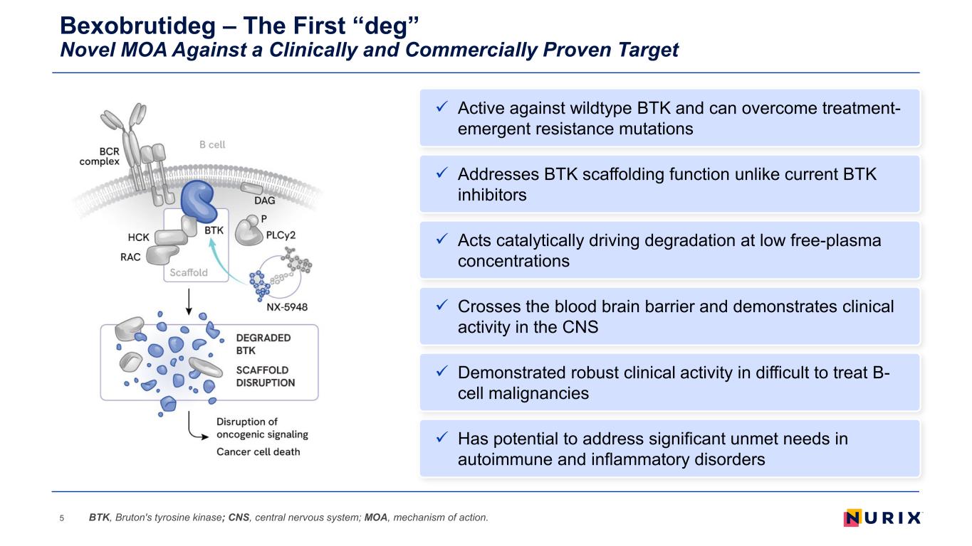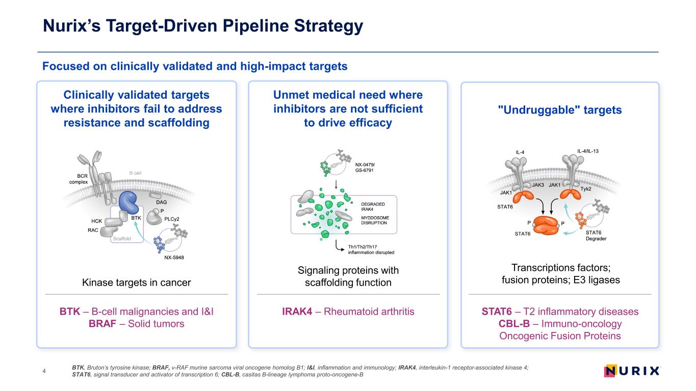 Focused on clinically validated and high-impact targets Nurix’s Target-Driven Pipeline Strategy BTK, Bruton’s tyrosine kinase; BRAF, v-RAF murine sarcoma viral oncogene homolog B1; I&I, inflammation and immunology; IRAK4, interleukin-1 receptor-associated kinase 4; STAT6, signal transducer and activator of transcription 6; CBL-B, casitas B-lineage lymphoma proto-oncogene-B4 Clinically validated targets where inhibitors fail to address resistance and scaffolding Unmet medical need where inhibitors are not sufficient to drive efficacy "Undruggable" targets Kinase targets in cancer BTK – B-cell malignancies and I&I BRAF – Solid tumors Signaling proteins with scaffolding function IRAK4 – Rheumatoid arthritis STAT6 – T2 inflammatory diseases CBL-B – Immuno-oncology Oncogenic Fusion Proteins Transcriptions factors; fusion proteins; E3 ligases