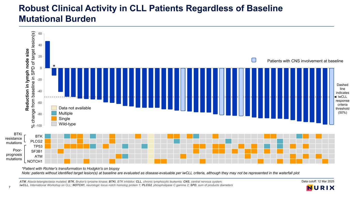 Bexobrutideg degrades gatekeeper, kinase- proficient and kinase-dead BTK mutations Bexobrutideg Degrades Wild-Type and Mutated BTK Note: Some patients have multiple BTK mutations BTK degradation in CLL patients BTK, Bruton’s tyrosine kinase; CLL, chronic lymphocytic leukemia; GI-50 growth inhibition 50%; MFI, mean fluorescence intensity; WT wildtype Data cutoff: 10 Oct 2024 6 Bexobrutideg shows superior mutational coverage and cell killing compared to BTK inhibitors WT C48 1S V41 6L T47 4I L5 28 W NX-5948 Ibrutinib Acalabrutinib Zanubrutinib Pirtobrutinib Vecabrutinib Fenebrutinib Nemtabrutinib GI-50 (nM) 0 1000 2000 3000 4000 5000 Most potent cell killing N on co va le nt in hi bi to rs C ov al en t in hi bi to rs