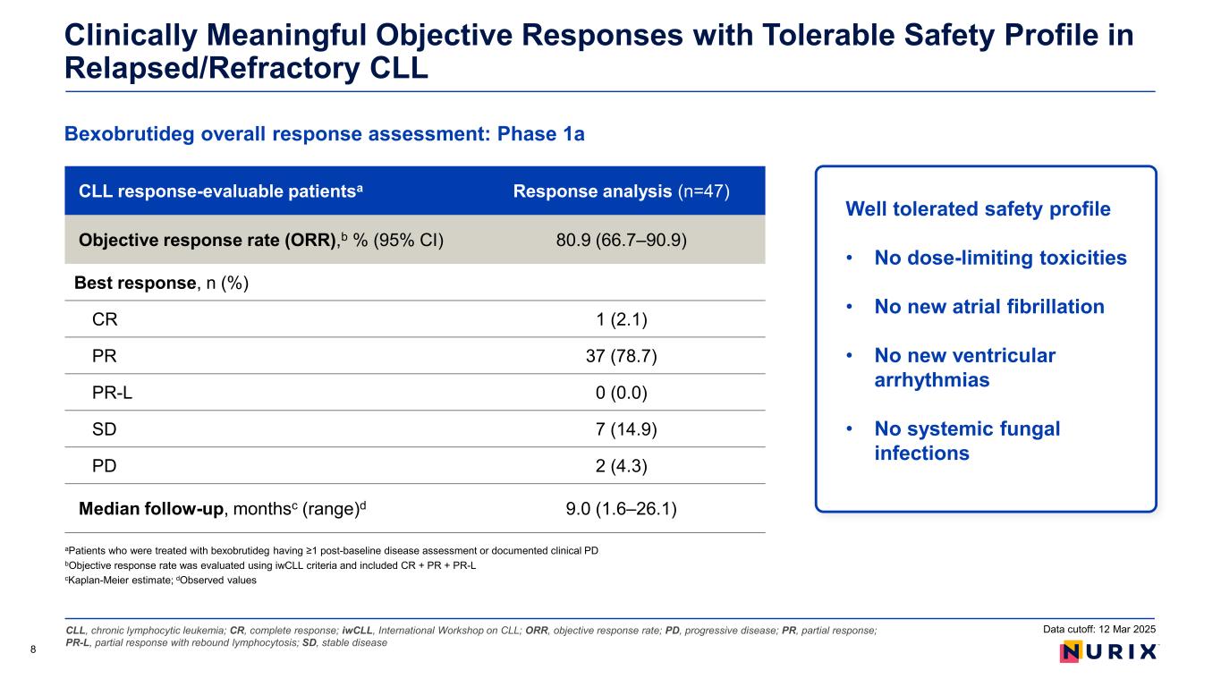 CLL, chronic lymphocytic leukemia; CR, complete response; iwCLL, International Workshop on CLL; ORR, objective response rate; PD, progressive disease; PR, partial response; PR-L, partial response with rebound lymphocytosis; SD, stable disease Bexobrutideg overall response assessment: Phase 1a Clinically Meaningful Objective Responses with Tolerable Safety Profile in Relapsed/Refractory CLL aPatients who were treated with bexobrutideg having ≥1 post-baseline disease assessment or documented clinical PD bObjective response rate was evaluated using iwCLL criteria and included CR + PR + PR-L cKaplan-Meier estimate; dObserved values 8 CLL response-evaluable patientsa Response analysis (n=47) Objective response rate (ORR),b % (95% CI) 80.9 (66.7–90.9) Best response, n (%) CR 1 (2.1) PR 37 (78.7) PR-L 0 (0.0) SD 7 (14.9) PD 2 (4.3) Median follow-up, monthsc (range)d 9.0 (1.6–26.1) Data cutoff: 12 Mar 2025 Well tolerated safety profile • No dose-limiting toxicities • No new atrial fibrillation • No new ventricular arrhythmias • No systemic fungal infections