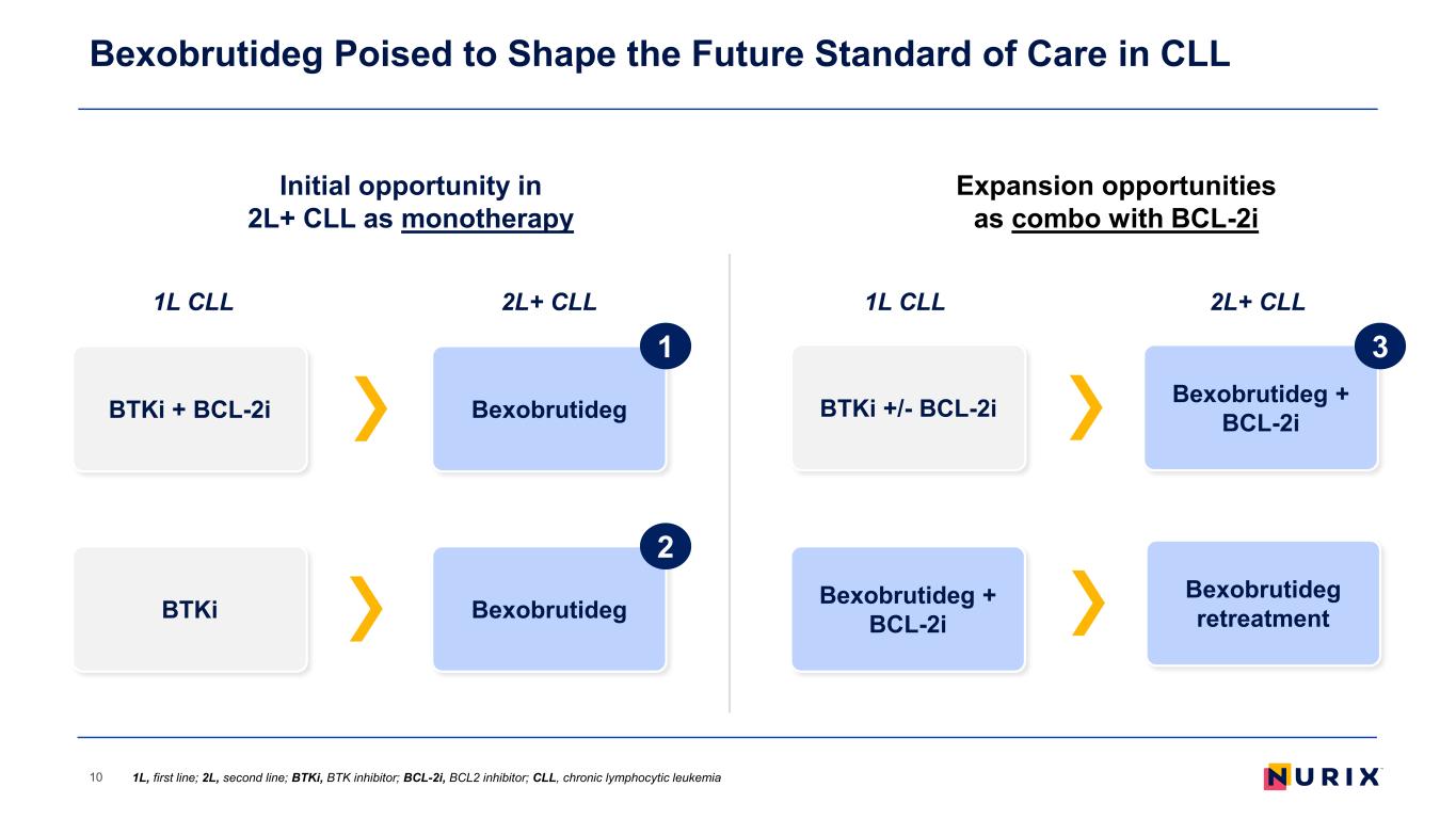 Advancing Bexobrutideg in CLL: Clinical Development Plan 9 Key summary points Positioned to lead a new class of therapeutics in CLL with best-in-class profile * Accelerated approval in the post-BTKi setting may be limited to the post-pirtobrutinib setting depending on evolving standard of care. BTKi, BTK inhibitor; BCL2i, BCL2 inhibitor; BR, bendamustine/rituximab; IR, idelalisib/rituximab; V +/- R, venetoclax (V) with or without rituximab (R); • Regulatory strategy: Accelerated Approval strategy* and confirmatory study • Addressable market: Address broad set of patient segments • Next steps: Initiate the potentially pivotal Phase 2 in H2 2025 pending agreement on dose with FDA per Project Optimus, followed by initiation of Phase 3 • Regulatory strategy: Broaden label to include combination with a BCL-2i • Addressable market: Enables broader use in both first and second line CLL patients • Next steps: Establish combination dose prior to initiation of pivotal study Bexdeg 3L+ Monotherapy Ph2, Post BTKi, Post-BCL-2i N= ~100 patients 1 Bexdeg 2L+ Monotherapy Ph3 Confirmatory, Post cBTKi Physician's choice pirtobrutinib/BR/IR N= ~400-500 patients 2 Bexdeg 1L+ Combo with Venetoclax +/- anti-CD20 Ph1b/2 N= ~60 patients 3