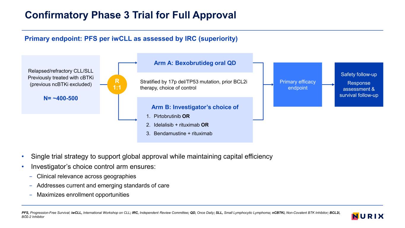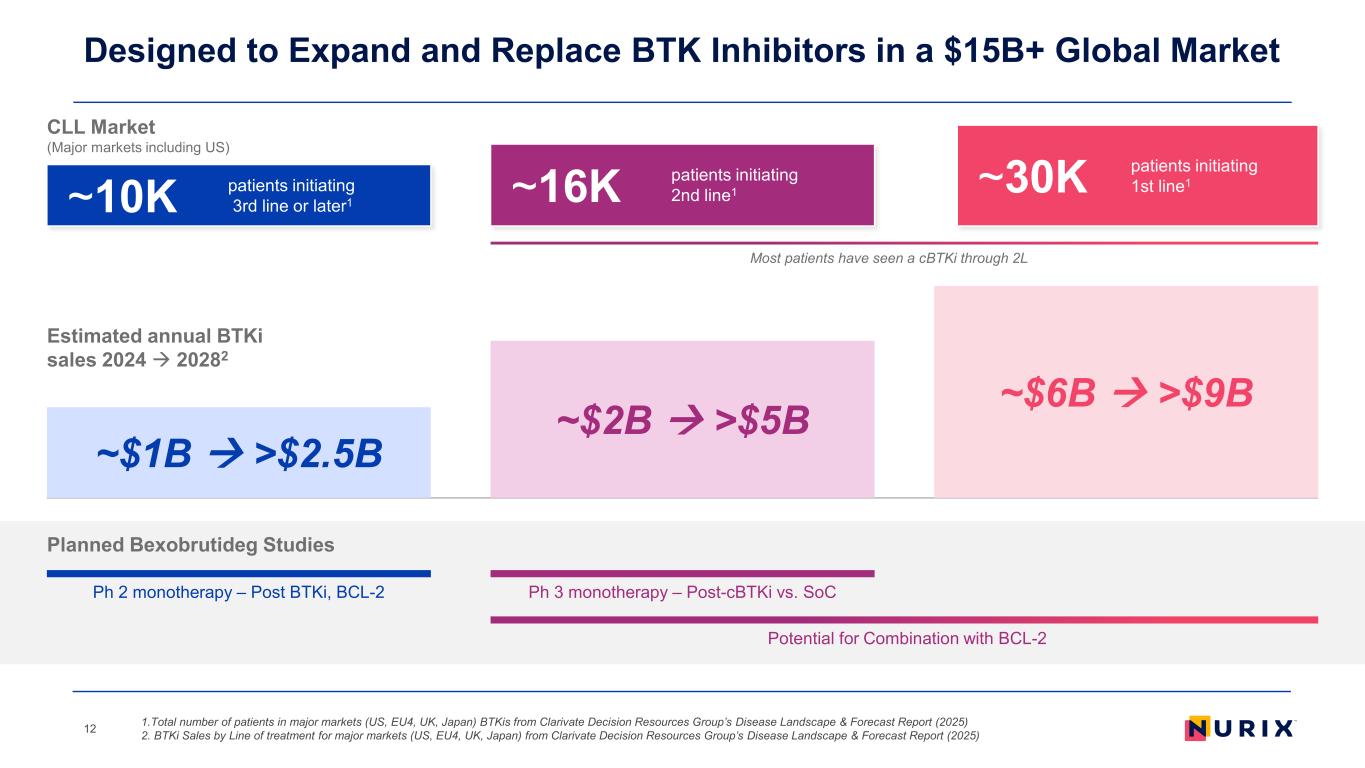 • Single trial strategy to support global approval while maintaining capital efficiency • Investigator’s choice control arm ensures: − Clinical relevance across geographies − Addresses current and emerging standards of care − Maximizes enrollment opportunities Primary endpoint: PFS per iwCLL as assessed by IRC (superiority) Confirmatory Phase 3 Trial for Full Approval 11 Stratified by 17p del/TP53 mutation, prior BCL2i therapy, choice of control Primary efficacy endpoint Relapsed/refractory CLL/SLL Previously treated with cBTKi (previous ncBTKi excluded) N= ~400-500 R 1:1 Arm A: Bexobrutideg oral QD Arm B: Investigator’s choice of 1. Pirtobrutinib OR 2. Idelalisib + rituximab OR 3. Bendamustine + rituximab Safety follow-up Response assessment & survival follow-up PFS, Progression-Free Survival; iwCLL, International Workshop on CLL; IRC, Independent Review Committee; QD, Once Daily; SLL, Small Lymphocytic Lymphoma; nCBTKi, Non-Covalent BTK Inhibitor; BCL2i, BCL-2 Inhibitor
