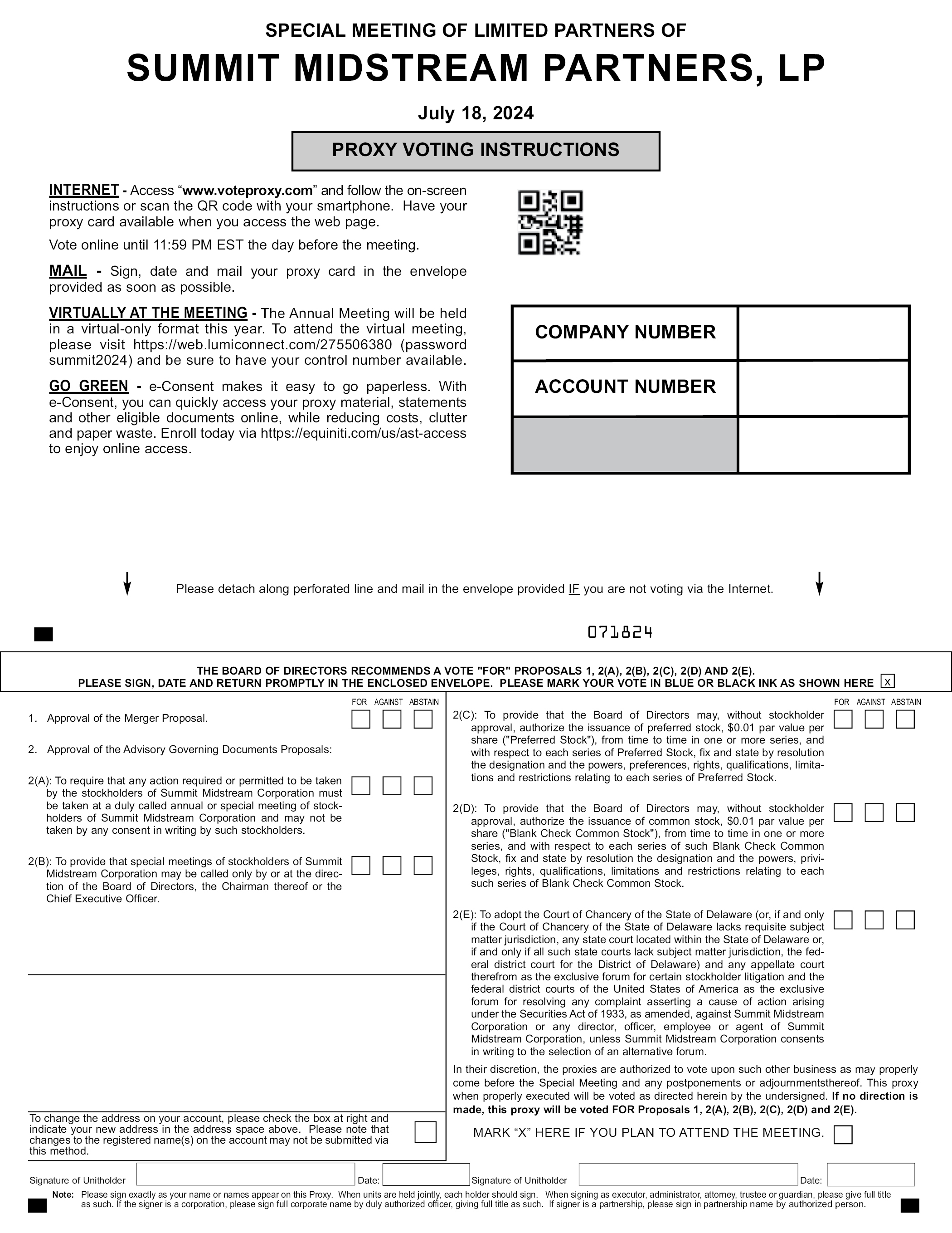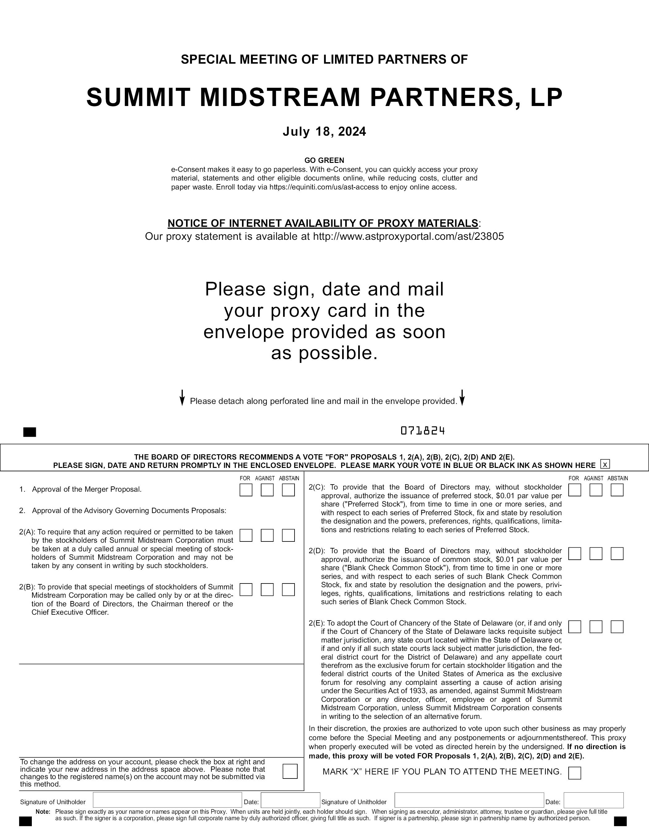 SPECIAL MEETING OF LIMITED PARTNERS OF SUMMIT MIDSTREAM PARTNERS, LP July 18, 2024 GO GREEN e-Consent makes it easy to go paperless. With e-Consent, you can quickly access your proxy material, statements and other eligible documents online, while reducing costs, clutter and paper waste. Enroll today via https://equiniti.com/us/ast-access to enjoy online access. NOTICE OF INTERNET AVAILABILITY OF PROXY MATERIALS: Our proxy statement is available at http://www.astproxyportal.com/ast/23805 Please sign, date and mail your proxy card in the envelope provided as soon as possible. Please detach along perforated line and mail in the envelope provided. 071824 THE BOARD OF DIRECTORS RECOMMENDS A VOTE “FOR” PROPOSALS 1, 2(A), 2(B), 2(C), 2(D) AND 2(E). PLEASE SIGN, DATE AND RETURN PROMPTLY IN THE ENCLOSED ENVELOPE. PLEASE MARK YOUR VOTE IN BLUE OR BLACK INK AS SHOWN HERE 1. Approval of the Merger Proposal. 2. Approval of the Advisory Governing Documents Proposals: 2(A): To require that any action required or permitted to be taken by the stockholders of Summit Midstream Corporation must be taken at a duly called annual or special meeting of stockholders of Summit Midstream Corporation and may not be taken by any consent in writing by such stockholders. 2(B): To provide that special meetings of stockholders of Summit Midstream Corporation may be called only by or at the direction of the Board of Directors, the Chairman thereof or the Chief Executive Officer. FOR AGAINST ABSTAIN 2(C): To provide that the Board of Directors may, without stockholder approval, authorize the issuance of preferred stock, $0.01 par value per share (“Preferred Stock”), from time to time in one or more series, and with respect to each series of Preferred Stock, fix and state by resolution the designation and the powers, preferences, rights, qualifications, limitations and restrictions relating to each series of Preferred Stock. 2(D): To provide that the Board of Directors may, without stockholder approval, authorize the issuance of common stock, $0.01 par value per share (“Blank Check Common Stock”), from time to time in one or more series, and with respect to each series of such Blank Check Common Stock, fix and state by resolution the designation and the powers, privileges, rights, qualifications, limitations and restrictions relating to each such series of Blank Check Common Stock. 2(E): To adopt the Court of Chancery of the State of Delaware (or, if and only if the Court of Chancery of the State of Delaware lacks requisite subject matter jurisdiction, any state court located within the State of Delaware or, if and only if all such state courts lack subject matter jurisdiction, the federal district court for the District of Delaware) and any appellate court therefrom as the exclusive forum for certain stockholder litigation and the federal district courts of the United States of America as the exclusive forum for resolving any complaint asserting a cause of action arising under the Securities Act of 1933, as amended, against Summit Midstream Corporation or any director, officer, employee or agent of Summit Midstream Corporation, unless Summit Midstream Corporation consents in writing to the selection of an alternative forum. In their discretion, the proxies are authorized to vote upon such other business as may properly come before the Special Meeting and any postponements or adjournmentsthereof. This proxy when properly executed will be voted as directed herein by the undersigned. If no direction is made, this proxy will be voted FOR Proposals 1, 2(A), 2(B), 2(C), 2(D) and 2(E). MARK “X” HERE IF YOU PLAN TO ATTEND THE MEETING. To change the address on your account, please check the box at right and indicate your new address in the address space above. Please note that changes to the registered name(s) on the account may not be submitted via this method. Signature of Unitholder Date: Note: Please sign exactly as your name or names appear on this Proxy. When units are held jointly, each holder should sign. When signing as executor, administrator, attorney, trustee or guardian, please give full title as such. If the signer is a corporation, please sign full corporate name by duly authorized officer, giving full title as such. If signer is a partnership, please sign in partnership name by authorized person
