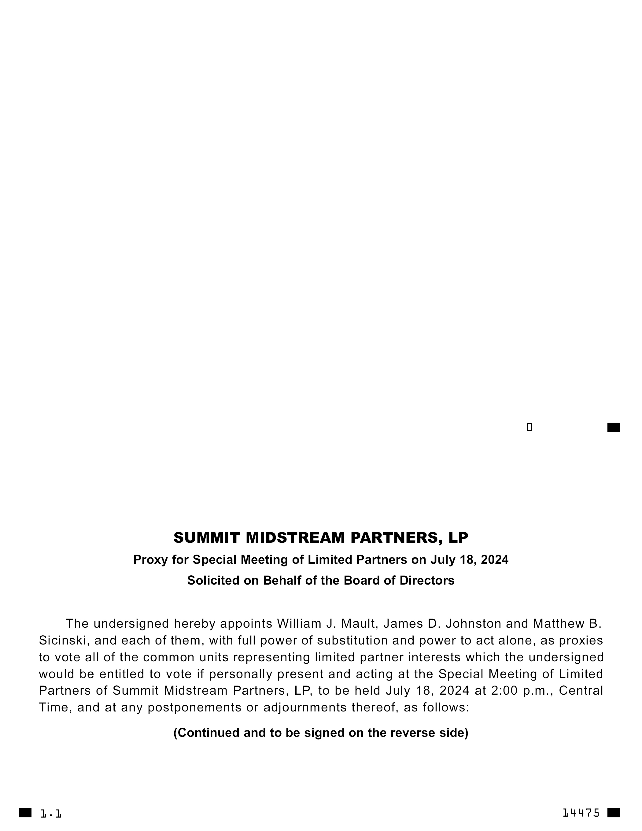 SUMMIT MIDSTREAM PARTNERS, LP Proxy for Special Meeting of Limited Partners on July 18, 2024 Solicited on Behalf of the Board of Directors The undersigned hereby appoints William J. Mault, James D. Johnston and Matthew B. Sicinski, and each of them, with full power of substitution and power to act alone, as proxies to vote all of the common units representing limited partner interests which the undersigned would be entitled to vote if personally present and acting at the Special Meeting of Limited Partners of Summit Midstream Partners, LP, to be held July 18, 2024 at 2:00 p.m., Central Time, and at any postponements or adjournments thereof, as follows: (Continued and to be signed on the reverse side) 1.1 14475