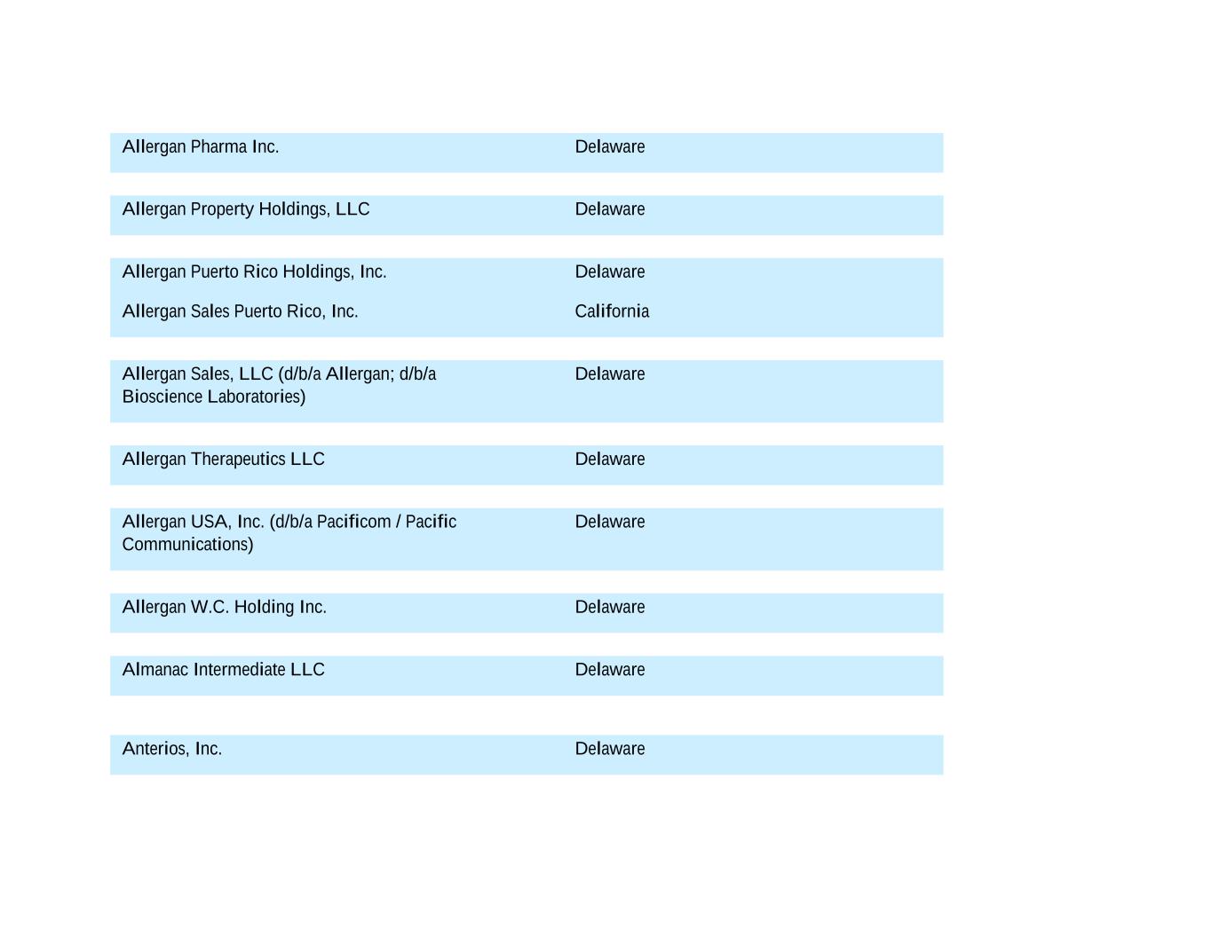 Allergan Pharma Inc. Delaware Allergan Property Holdings, LLC Delaware Allergan Puerto Rico Holdings, Inc. Delaware Allergan Sales Puerto Rico, Inc. California Allergan Sales, LLC (d/b/a Allergan; d/b/a Bioscience Laboratories) Delaware Allergan Therapeutics LLC Delaware Allergan USA, Inc. (d/b/a Pacificom / Pacific Communications) Delaware Allergan W.C. Holding Inc. Delaware Almanac Intermediate LLC Delaware Anterios, Inc. Delaware