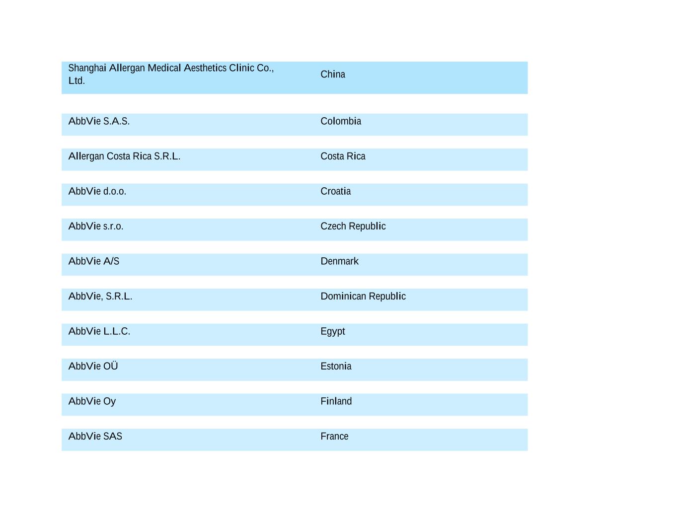 Shanghai Allergan Medical Aesthetics Clinic Co., Ltd. China AbbVie S.A.S. Colombia Allergan Costa Rica S.R.L. Costa Rica AbbVie d.o.o. Croatia AbbVie s.r.o. Czech Republic AbbVie A/S Denmark AbbVie, S.R.L. Dominican Republic AbbVie L.L.C. Egypt AbbVie OÜ Estonia AbbVie Oy Finland AbbVie SAS France