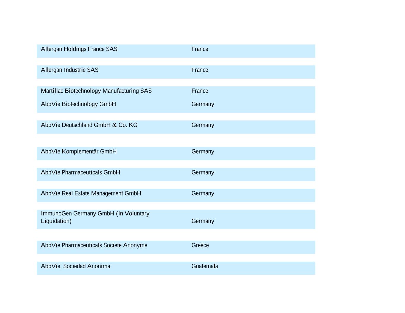 Allergan Holdings France SAS France Allergan Industrie SAS France Martillac Biotechnology Manufacturing SAS France AbbVie Biotechnology GmbH Germany AbbVie Deutschland GmbH & Co. KG Germany AbbVie Komplementär GmbH Germany AbbVie Pharmaceuticals GmbH Germany AbbVie Real Estate Management GmbH Germany ImmunoGen Germany GmbH (In Voluntary Liquidation) Germany AbbVie Pharmaceuticals Societe Anonyme Greece AbbVie, Sociedad Anonima Guatemala