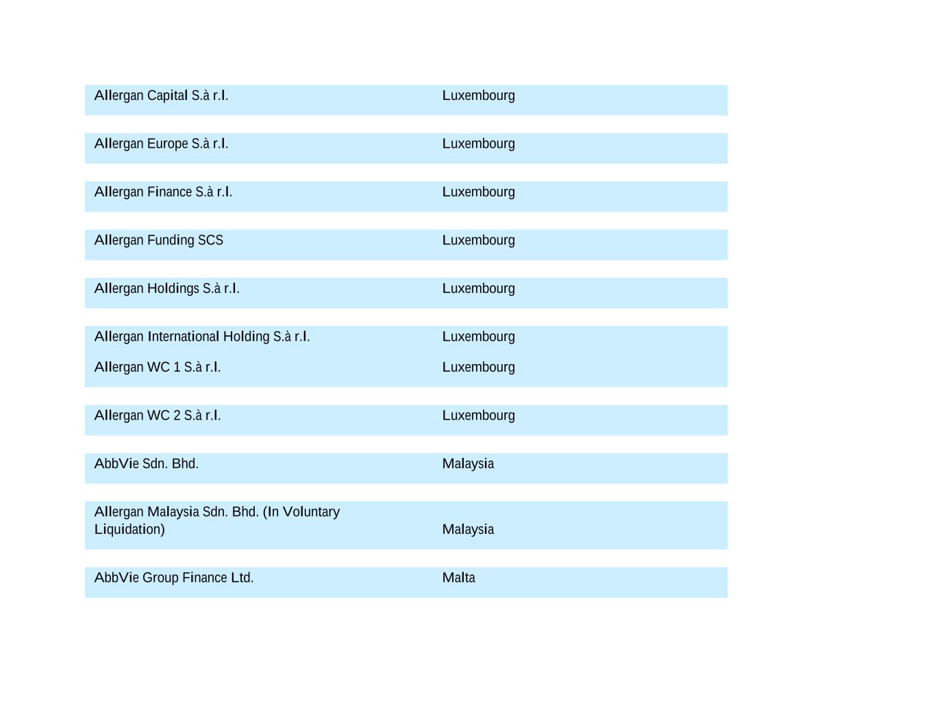 Allergan Capital S.à r.l. Luxembourg Allergan Europe S.à r.l. Luxembourg Allergan Finance S.à r.l. Luxembourg Allergan Funding SCS Luxembourg Allergan Holdings S.à r.l. Luxembourg Allergan International Holding S.à r.l. Luxembourg Allergan WC 1 S.à r.l. Luxembourg Allergan WC 2 S.à r.l. Luxembourg AbbVie Sdn. Bhd. Malaysia Allergan Malaysia Sdn. Bhd. (In Voluntary Liquidation) Malaysia AbbVie Group Finance Ltd. Malta