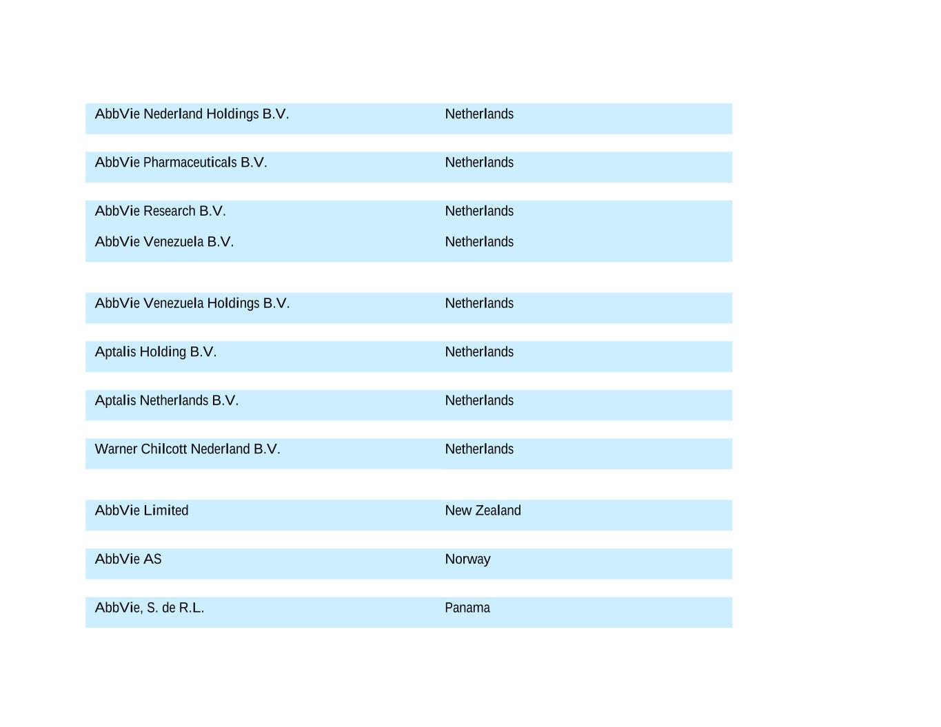 AbbVie Nederland Holdings B.V. Netherlands AbbVie Pharmaceuticals B.V. Netherlands AbbVie Research B.V. Netherlands AbbVie Venezuela B.V. Netherlands AbbVie Venezuela Holdings B.V. Netherlands Aptalis Holding B.V. Netherlands Aptalis Netherlands B.V. Netherlands Warner Chilcott Nederland B.V. Netherlands AbbVie Limited New Zealand AbbVie AS Norway AbbVie, S. de R.L. Panama