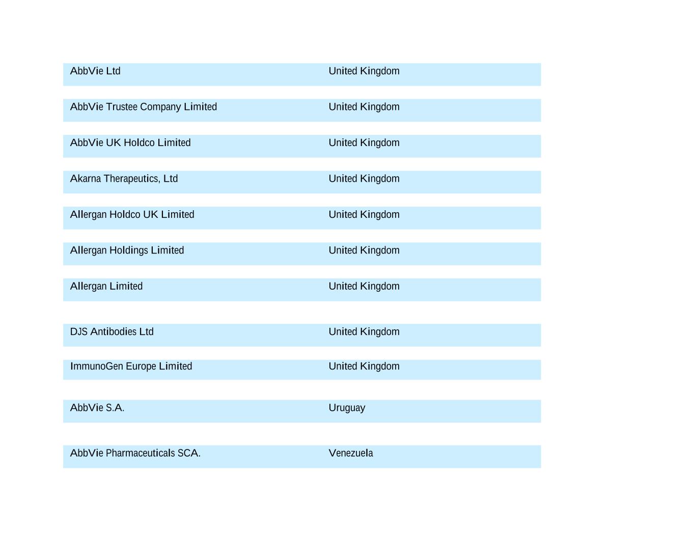 AbbVie Ltd United Kingdom AbbVie Trustee Company Limited United Kingdom AbbVie UK Holdco Limited United Kingdom Akarna Therapeutics, Ltd United Kingdom Allergan Holdco UK Limited United Kingdom Allergan Holdings Limited United Kingdom Allergan Limited United Kingdom DJS Antibodies Ltd United Kingdom ImmunoGen Europe Limited United Kingdom AbbVie S.A. Uruguay AbbVie Pharmaceuticals SCA. Venezuela