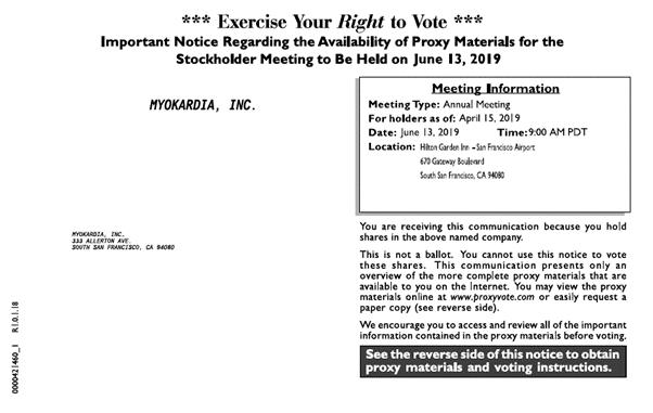 Meeting InformationMeeting Type: Annual MeetingFor holders as of: April 15, 2019Date: June 13, 2019Time:9:00 AM PDTLocation: Hilton Garden Inn - San Francisco Airport 670 Gawte ay BoulevardSouth San Francisco, CA 94080 MYOKARDIA,INC.*** Exercise Your Right to Vote ***Important Notice Regarding the Availability of Proxy Materials for the Stockholder Meeting to Be Held on June 13, 2019 You are receiving this communication because you hold shares in the above named company.This is not a ballot. You cannot use this notice to vote these shares. This communication presents only an overview of the more complete proxy materials that areavailable to you on the Internet. You may view the proxy materials online at www. proxyvo te.com or easily request a paper copy (see reverse side).We encourage you to access and review all of the important information contained in the proxy materials before voting.MYOKARDIA, INC.333 ALLERTON AVE.SOUTH SAN FRANCI SCO, CA 94080 coa::;;;1