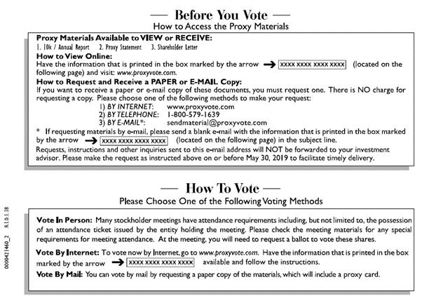 Before You Vote -How to Access the Proxy MaterialsProxy Materials Available to VIEW or RECEIVE:I. I Ok / Annual Report2. Proxy Statement3. Shareholder LetterHow to View Online:Have the information that is printed in the box marked by the arrow How to Request and Receive a PAPER or E-MAIL Copy:If you want to receive a paper or e-mail copy of these documents, you must request one. There is NO charge for requesting a copy. Please choose one of the following methods to make your request:I) BY INTERNET:www.proxyvote.com 2) BY TELEPHONE:1-8 00-579-16 393) BY E-MA I L* :se ndmate rial@ proxyvote .co m* If requesting materials by e-ma il , please send a blank e-mail with the information that is printed in the box marked by the arrow(located on the following page) in the subject line.Requests, instructions and other inquiries sent to this e-mail address will NOT be forwarded to your investment advisor. Please make the request as instructed above on or before May 30, 2019 to facilitate timely delivery.located on the Vote In Person: Many stockholder meetings have attendance requirements includ ing, but not limited to, the possession of an attendance ticket issued by the entity holding the meeting. Please check the meeting materials for any special requirements for meeting attendance. At the meeting, you will need to request a ballot to vote these shares.Vote By Internet: Tovote now by Internet.go to www.proxyvote.com. Have the information that is printed in the box marked by the arrowavailable and follow the i nst ruct io ns.Vote By Mail: You can vote by mail by requesting a paper copy of the mater ials , which will include a proxy card.