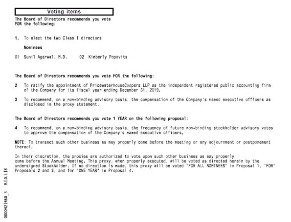 Voting itemsThe Board of Di rectors recommends you vote FOR the to11owi ng :To elect the two Class I d i recto rs Nominees01 Su nil Aga rwa l , M. D.02 Kimberly Pop ov i tsThe Board of Di rectors recommends you vote FOR the to11owing:To ratify the appointment of Pri cewat er houseCoopers LLP as the i ndependent registered public accounting firm of the Company for its fiscal year ending December 31, 2019.To recommend, on a non-binding advi sor y basis , the cmo pensat ion of t he Company's named executive off i ce rs as disclosed in the proxy st at me ent .The Board of Directors recommends you vote 1 YEAR on the following pr oposal :To recommend, on a non -bi nd i ng adv i sor y basis , t he f req uency of f ut u re non - bi nd i ng stockholder adv i sory vo t es to appro ve the compensation of the Company's named executive officers.NOTE: To transact such other business as may properly come before them eet i ng or any adjournment or postponement t hereof .In their d iscr et ion , t he proxies ar e a ut hori zed to vot e upon such other business asm a y properlycome before t he Annual Meet i ng . This proxy ,w hen properly exec ut ed ,w il l be voted as d i rect ed here i n by t heun der si gn ed Stoc kholder . If no direction ism ade , this proxy will be voted "FOR ALL NOMI NEE S" in Proposal 1 , " FOR " Proposa ls 2 a nd 3, and for "ONE YEAR" in Proposal 4