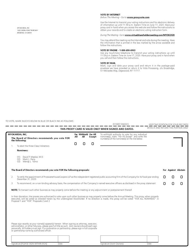 VOTE BY INTERNET Before The Meeting - Go to www.proxyvote.com Use the Internet to transmit your voting instructions and for electronic delivery of information up until 11:59 p.m. Eastern Time on June 17, 2020. Have your proxy card in hand when you access the web site and follow the instructions to obtain your records and to create an electronic voting instruction form. During The Meeting - Go to www.virtualshareholdermeeting.com/MYOK2020 You may attend the meeting via the Internet and vote during the meeting. Have the information that is printed in the box marked by the arrow available and follow the instructions. VOTE BY PHONE - 1-800-690-6903 Use any touch-tone telephone to transmit your voting instructions up until 11:59 p.m. Eastern Time on June 17, 2020. Have your proxy card in hand when you call and then follow the instructions. VOTE BY MAIL Mark, sign and date your proxy card and return it in the postage-paid envelope we have provided or return it to Vote Processing, c/o Broadridge, 51 Mercedes Way, Edgewood, NY 11717. MYOKARDIA, INC. 1000 SIERRA POINT PARKWAY BRISBANE, CA 94005 D15957-P40023 For All Withhold All For All Except To withhold authority to vote for any individual nominee(s), mark "For All Except" and write the number(s) of the nominee(s) on the line below. MYOKARDIA, INC. The Board of Directors recommends you vote FOR the following: 1.To elect the three Class II directors Nominees: 01)David P. Meeker, M.D. 02)Mark L. Perry 03)Wendy L. Yarno For Against Abstain The Board of Directors recommends you vote FOR the following proposals: 2.To ratify the appointment of PricewaterhouseCoopers LLP as the independent registered public accounting firm of the Company for its fiscal year ending December 31, 2020. 3.To recommend, on a non-binding advisory basis, the compensation of the Company's named executive officers as disclosed in the proxy statement. NOTE: To transact such other business as may properly come before the meeting or any adjournment or postponement thereof. In their discretion, the proxies are authorized to vote upon such other business as may properly come before the Annual Meeting. This proxy, when properly executed, will be voted as directed herein by the undersigned Stockholder. If no direction is made, this proxy will be voted "FOR ALL NOMINEES" in Proposal 1 and "FOR" Proposals 2 and 3. Please sign exactly as your name(s) appear(s) hereon. When signing as attorney, executor, administrator, or other fiduciary, please give full title as such. Joint owners should each sign personally. All holders must sign. If a corporation or partnership, please sign in full corporate or partnership name by authorized officer.
