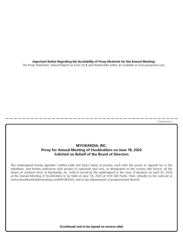 Important Notice Regarding the Availability of Proxy Materials for the Annual Meeting: The Proxy Statement, Annual Report on Form 10-K and Shareholder Letter are available at www.proxyvote.com. D15958-P40023 MYOKARDIA, INC. Proxy for Annual Meeting of Stockholders on June 18, 2020 Solicited on Behalf of the Board of Directors The undersigned hereby appoints Cynthia Ladd and Taylor Harris as proxies, each with the power to appoint his or her substitute, and hereby authorizes such proxies to represent and vote, as designated on the reverse side hereof, all the shares of common stock of MyoKardia, Inc. held of record by the undersigned at the close of business on April 20, 2020 at the Annual Meeting of Stockholders to be held on June 18, 2020 at 9:00 AM Pacific Time, virtually via live webcast at www.virtualshareholdermeeting.com/MYOK2020, and at any adjournment or postponement thereof. (Continued and to be signed on reverse side)