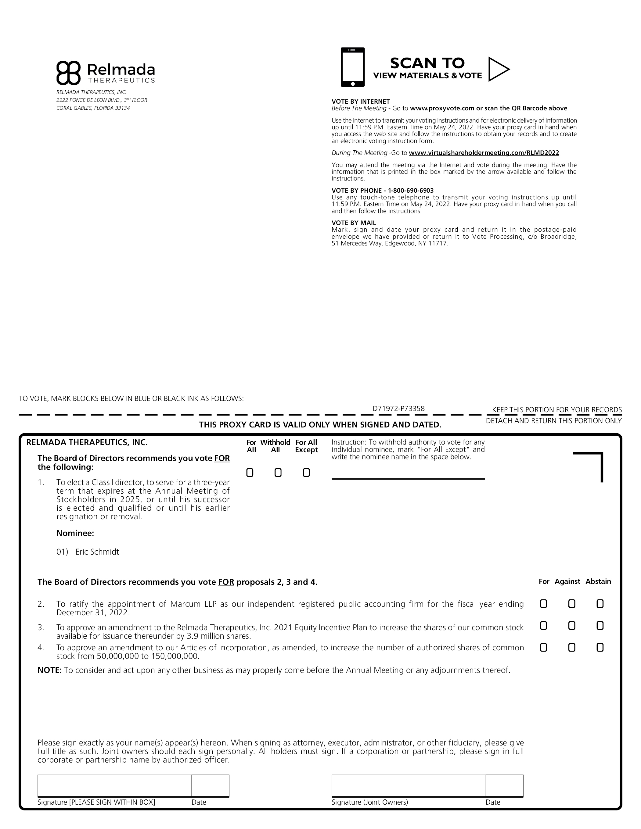 SCAN TO VIEW MATERIALS & VOTE RELMADA THERAPEUTICS, INC. 2222 PONCE DE LEON BLVD., 3RD FLOOR CORAL GABLES, FLORIDA 33134 VOTE BY INTERNET Before The Meeting - Go to www.proxyvote.com or scan the QR Barcode above Use the Internet to transmit your voting instructions and for electronic delivery of information up until 11:59 P.M. Eastern Time on May 24, 2022. Have your proxy card in hand when you access the web site and follow the instructions to obtain your records and to create an electronic voting instruction form. During The Meeting -Go to www.virtualshareholdermeeting.com/RLMD2022 You may attend the meeting via the Internet and vote during the meeting. Have the information that is printed in the box marked by the arrow available and follow the instructions. VOTE BY PHONE - 1-800-690-6903 Use any touch-tone telephone to transmit your voting instructions up until 11:59 P.M. Eastern Time on May 24, 2022. Have your proxy card in hand when you call and then follow the instructions. VOTE BY MAIL Mark, sign and date your proxy card and return it in the postage-paid envelope we have provided or return it to Vote Processing, c/o Broadridge, 51 Mercedes Way, Edgewood, NY 11717. TO VOTE, MARK BLOCKS BELOW IN BLUE OR BLACK INK AS FOLLOWS: D71972-P73358 KEEP THIS PORTION FOR YOUR RECORDS THIS PROXY CARD IS VALID ONLY WHEN SIGNED AND DATED. DETACH AND RETURN THIS PORTION ONLY RELMADA THERAPEUTICS, INC. For Withhold For All Instruction: To withhold authority to vote for any The Board of Directors recommends you vote FOR All All Except individual nominee, mark “For All Except” and write the nominee name in the space below. the following: 1. To elect a Class I director, to serve for a three-year term that expires at the Annual Meeting of Stockholders in 2025, or until his successor is elected and qualified or until his earlier resignation or removal. Nominee: 01) Eric Schmidt ! ! ! The Board of Directors recommends you vote FOR proposals 2, 3 and 4. For Against Abstain 2. To ratify the appointment of Marcum LLP as our independent registered public accounting firm for the fiscal year ending ! ! ! December 31, 2022. 3. To approve an amendment to the Relmada Therapeutics, Inc. 2021 Equity Incentive Plan to increase the shares of our common stock ! ! ! available for issuance thereunder by 3.9 million shares. 4. To approve an amendment to our Articles of Incorporation, as amended, to increase the number of authorized shares of common ! ! ! stock from 50,000,000 to 150,000,000. NOTE: To consider and act upon any other business as may properly come before the Annual Meeting or any adjournments thereof. Please sign exactly as your name(s) appear(s) hereon. When signing as attorney, executor, administrator, or other fiduciary, please give full title as such. Joint owners should each sign personally. All holders must sign. If a corporation or partnership, please sign in full corporate or partnership name by authorized officer. Signature [PLEASE SIGN WITHIN BOX] Date Signature (Joint Owners) Date