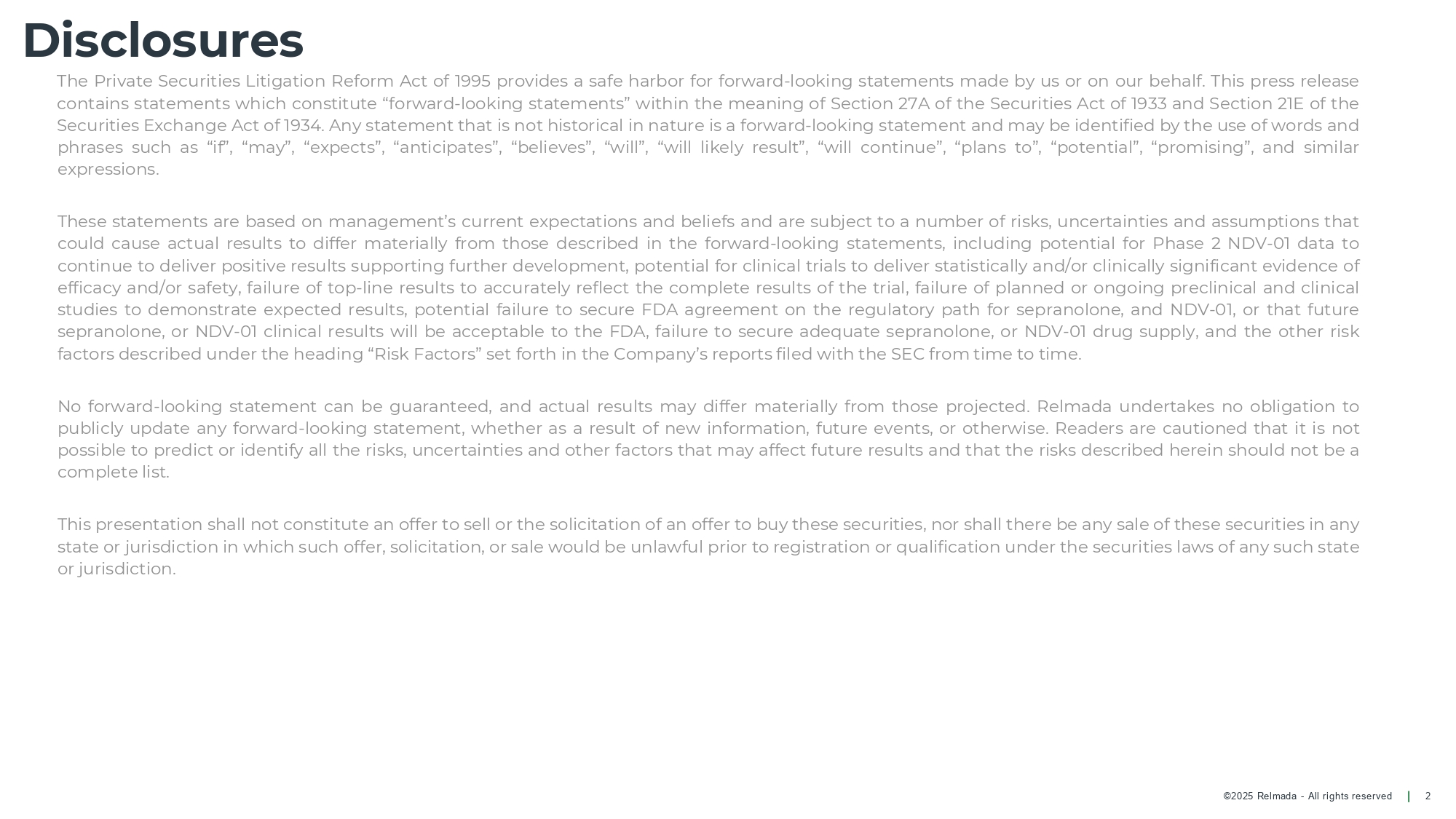©2025 Relmada - All rights reserved Disclosures The Private Securities Litigation Reform Act of 1995 provides a safe harbor for forward - looking statements made by us or on our behalf . This press release contains statements which constitute “forward - looking statements” within the meaning of Section 27 A of the Securities Act of 1933 and Section 21 E of the Securities Exchange Act of 1934 . Any statement that is not historical in nature is a forward - looking statement and may be identified by the use of words and phrases such as “if”, “may”, “expects”, “anticipates”, “believes”, “will”, “will likely result”, “will continue”, “plans to”, “potential”, “promising”, and similar expressions . 2 These statements are based on management’s current expectations and beliefs and are subject to a number of risks, uncertainties and assumptions that could cause actual results to differ materially from those described in the forward - looking statements, including potential for Phase 2 NDV - 01 data to continue to deliver positive results supporting further development, potential for clinical trials to deliver statistically and/or clinically significant evidence of efficacy and/or safety, failure of top - line results to accurately reflect the complete results of the trial, failure of planned or ongoing preclinical and clinical studies to demonstrate expected results, potential failure to secure FDA agreement on the regulatory path for sepranolone, and NDV - 01 , or that future sepranolone, or NDV - 01 clinical results will be acceptable to the FDA, failure to secure adequate sepranolone, or NDV - 01 drug supply, and the other risk factors described under the heading “Risk Factors” set forth in the Company’s reports filed with the SEC from time to time . No forward - looking statement can be guaranteed, and actual results may differ materially from those projected . Relmada undertakes no obligation to publicly update any forward - looking statement, whether as a result of new information, future events, or otherwise . Readers are cautioned that it is not possible to predict or identify all the risks, uncertainties and other factors that may affect future results and that the risks described herein should not be a complete list . This presentation shall not constitute an offer to sell or the solicitation of an offer to buy these securities, nor shall there be any sale of these securities in any state or jurisdiction in which such offer, solicitation, or sale would be unlawful prior to registration or qualification under the securities laws of any such state or jurisdiction .