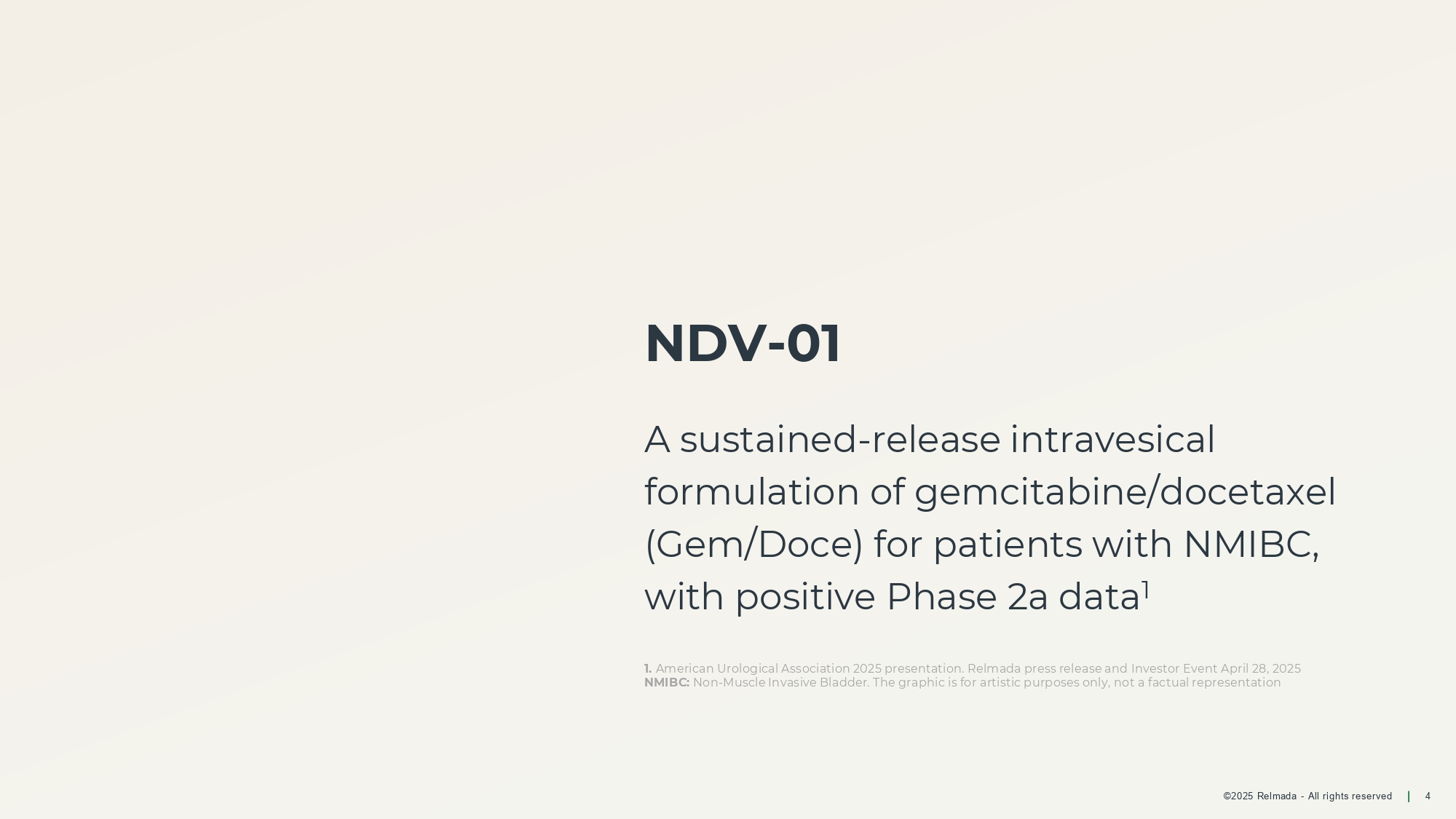 ©2025 Relmada - All rights reserved 4 NDV - 01 A sustained - release intravesical formulation of gemcitabine/docetaxel (Gem/Doce) for patients with NMIBC, with positive Phase 2a data 1 1. American Urological Association 2025 presentation. Relmada press release and Investor Event April 28, 2025 NMIBC: Non - Muscle Invasive Bladder. The graphic is for artistic purposes only, not a factual representation