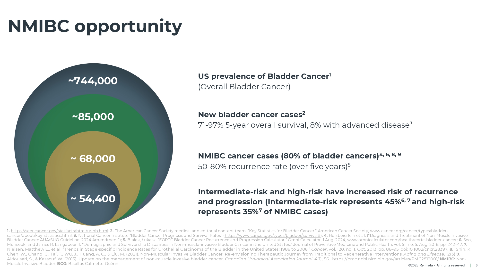 ©2025 Relmada - All rights reserved NMIBC opportunity 6 New bladder cancer cases 2 71 - 97% 5 - year overall survival, 8% with advanced disease 3 NMIBC cancer cases (80% of bladder cancers) 4, 6, 8, 9 50 - 80% recurrence rate (over five years) 5 US prevalence of Bladder Cancer 1 (Overall Bladder Cancer) Intermediate - risk and high - risk have increased risk of recurrence and progression (Intermediate - risk represents 45% 6, 7 and high - risk represents 35% 7 of NMIBC cases) ~ 68,000 ~85,000 ~744,000 ~ 54,400 1. https://seer.cancer.gov/statfacts/html/urinb.htm l ; 2. The American Cancer Society medical and editorial content team. “Key Statistics for Bladder Cancer.” American Cancer Society, www.cancer.org/cancer/types/bladder - cancer/about/key - statistics.html; 3. National Cancer Institute “Bladder Cancer Prognosis and Survival Rates” ( https:// www.cancer.gov/types/bladder/survival# ); 4. Holzbeierlein et al. (“Diagnosis and Treatment of Non - Muscle Invasive Bladder Cancer: AUA/SUO Guideline: 2024 Amendment”); 5. Białek, Łukasz. “EORTC Bladder Cancer Recurrence and Progression Calculator.” Omni Calculator, 1 Aug. 2024, www.omnicalculator.com/health/eortc - bladder - cancer; 6. Seo, Munseok, and James R. Langabeer II. “Demographic and Survivorship Disparities in Non – muscle - invasive Bladder Cancer in the United States.” Journal of Preventive Medicine and Public Health, vol. 51, no. 5, Aug. 2018, pp. 242 – 47; 7. Nielsen, Matthew E., et al. “Trends in Stage-specific Incidence Rates for Urothelial Carcinoma of the Bladder in the United States: 1988 to 2006.” Cancer , vol. 120, no. 1, Oct. 2013, pp. 86 – 95, doi:10.1002/cncr.28397. 8. Shih, K., Chen, W., Chang, C., Tai, T., Wu, J., Huang, A. C., & Liu, M. (2021). Non - Muscular Invasive Bladder Cancer: Re - envisioning Therapeutic Journey from Traditional to Regenerative Interventions. Aging and Disease , 12 (3) 9. Aldousari, S., & Kassouf, W. (2013). Update on the management of non - muscle invasive bladder cancer. Canadian Urological Association Journal , 4 (1), 56. https://pmc.ncbi.nlm.nih.gov/articles/PMC2812001/ NMIBC: Non - Muscle Invasive Bladder; BCG: Bacillus Calmette - Guérin