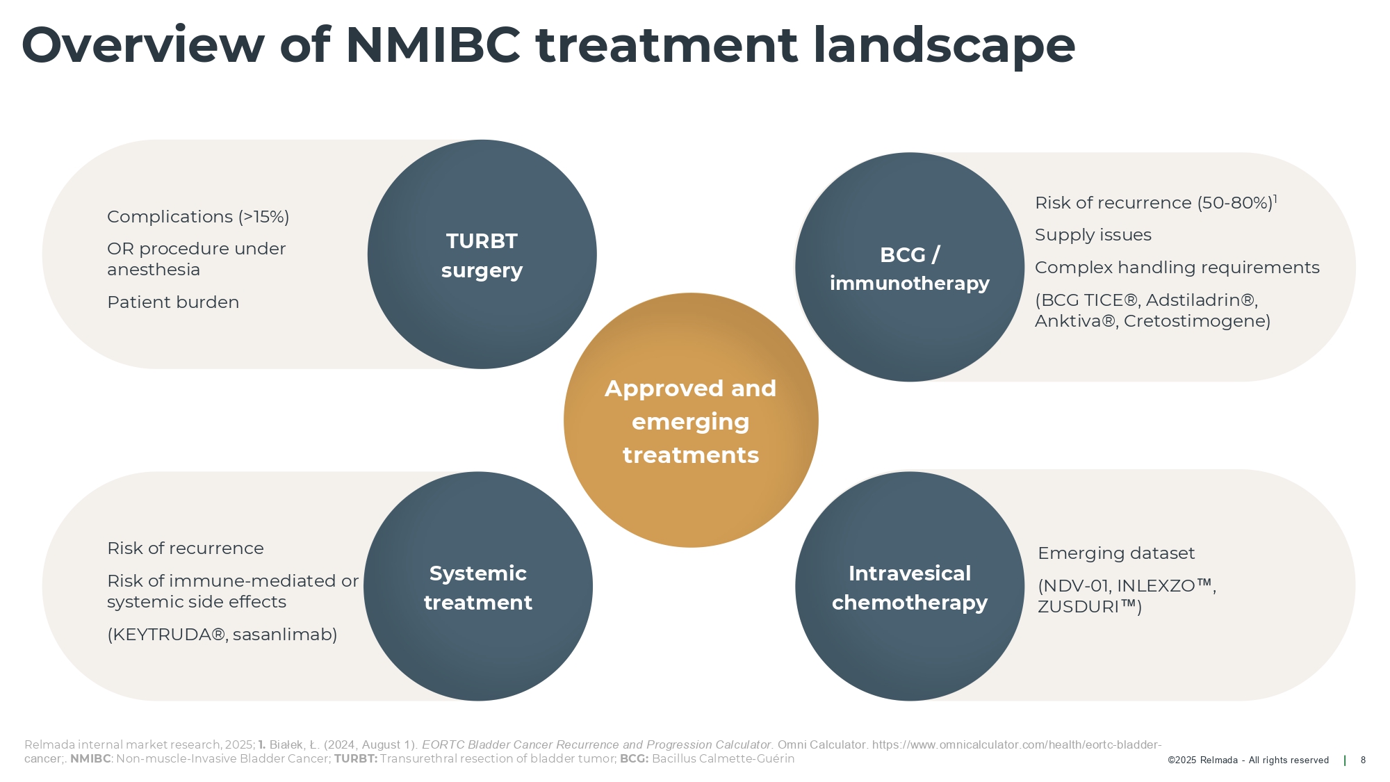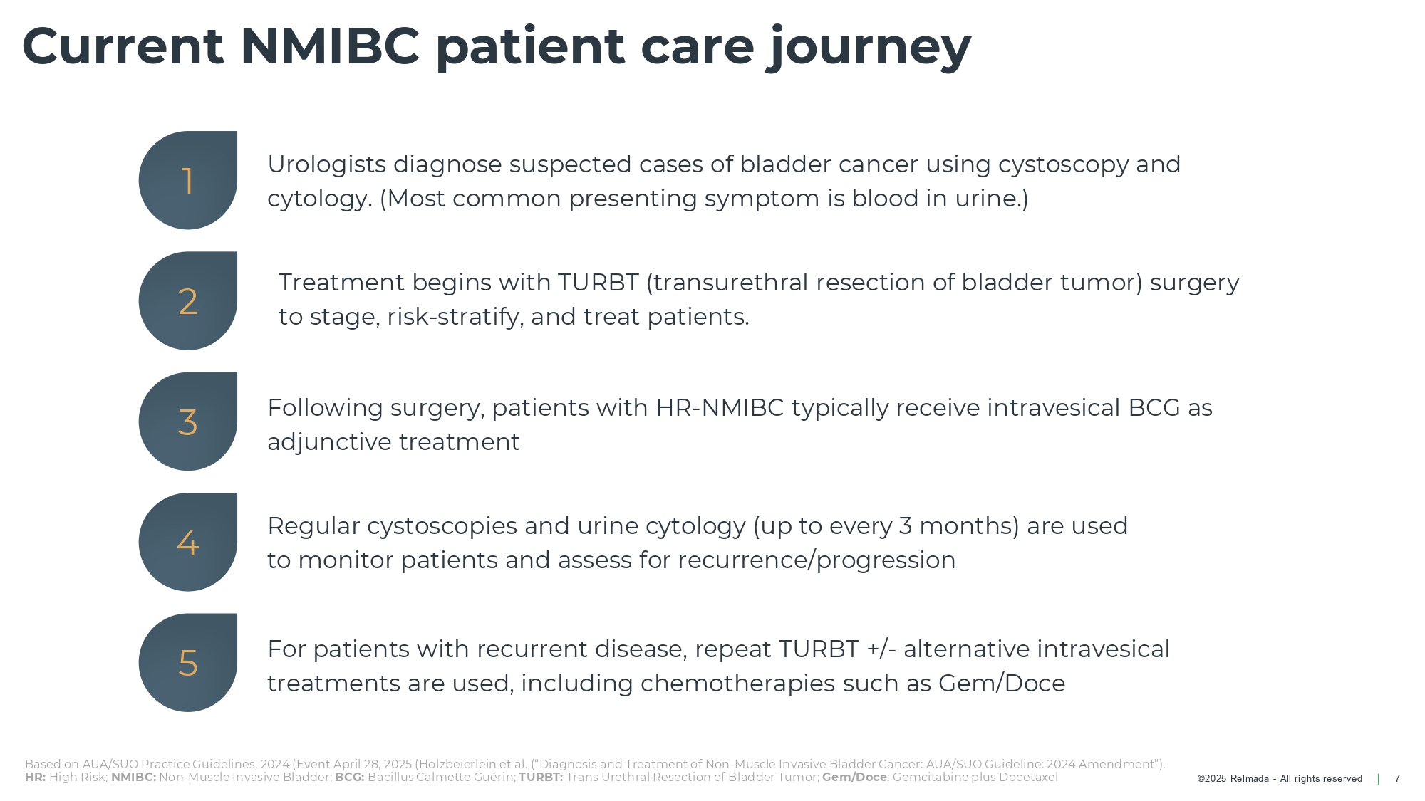 ©2025 Relmada - All rights reserved Current NMIBC patient care journey 7 Treatment begins with TURBT (transurethral resection of bladder tumor) surgery to stage, risk - stratify, and treat patients. Following surgery, patients with HR - NMIBC typically receive intravesical BCG as adjunctive treatment Urologists diagnose suspected cases of bladder cancer using cystoscopy and cytology. (Most common presenting symptom is blood in urine.) For patients with recurrent disease, repeat TURBT +/ - alternative intravesical treatments are used, including chemotherapies such as Gem/Doce Regular cystoscopies and urine cytology (up to every 3 months) are used to monitor patients and assess for recurrence/progression 1 2 3 4 5 Based on AUA/SUO Practice Guidelines, 2024 (Event April 28, 2025 (Holzbeierlein et al. (“Diagnosis and Treatment of Non - Muscle Invasive Bladder Cancer: AUA/SUO Guideline: 2024 Amendment”). HR: High Risk; NMIBC: Non - Muscle Invasive Bladder; BCG: Bacillus Calmette Guérin; TURBT: Trans Urethral Resection of Bladder Tumor; Gem/Doce : Gemcitabine plus Docetaxel