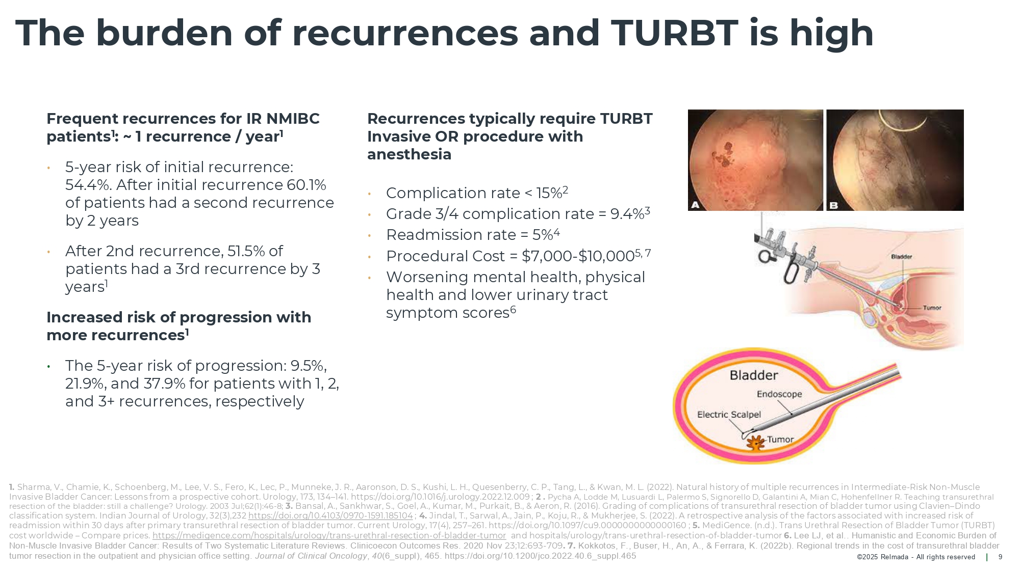 ©2025 Relmada - All rights reserved 9 The burden of recurrences and TURBT is high Recurrences typically require TURBT Invasive OR procedure with anesthesia • Complication rate < 15% 2 • Grade 3/4 complication rate = 9.4% 3 • Readmission rate = 5% 4 • Procedural Cost = $7,000 - $10,000 5, 7 • Worsening mental health, physical health and lower urinary tract symptom scores 6 1. Sharma, V., Chamie, K., Schoenberg, M., Lee, V. S., Fero, K., Lec, P., Munneke, J. R., Aaronson, D. S., Kushi, L. H., Quesenberry, C. P., Tang, L., & Kwan, M. L. (2022). Natural history of multiple recurrences in Intermediate - Risk Non - Muscle Invasive Bladder Cancer: Lessons from a prospective cohort. Urology, 173, 134 – 141. https://doi.org/10.1016/j.urology.2022.12.009 ; 2 . Pycha A, Lodde M, Lusuardi L, Palermo S, Signorello D, Galantini A, Mian C, Hohenfellner R. Teaching transurethral resection of the bladder: still a challenge? Urology. 2003 Jul;62(1):46 - 8; 3. Bansal, A., Sankhwar, S., Goel, A., Kumar, M., Purkait, B., & Aeron, R. (2016). Grading of complications of transurethral resection of bladder tumor using Clavien – Dindo classification system. Indian Journal of Urology, 32(3),232 https://doi.org/10.4103/0970 - 1591.185104 ; 4. Jindal, T., Sarwal, A., Jain, P., Koju, R., & Mukherjee, S. (2022). A retrospective analysis of the factors associated with increased risk of readmission within 30 days after primary transurethral resection of bladder tumor. Current Urology, 17(4), 257 – 261. https://doi.org/10.1097/cu9.0000000000000160 ; 5. MediGence. (n.d.). Trans Urethral Resection of Bladder Tumor (TURBT) cost worldwide – Compare prices. https://medigence.com/hospitals/urology/trans - urethra l - resection - of - bladder - tumor and hospitals/urology/trans - urethral - resection - of - bladder - tumor 6. Lee LJ, et al.. Humanistic and Economic Burden of Non - Muscle Invasive Bladder Cancer: Results of Two Systematic Literature Reviews. Clinicoecon Outcomes Res. 2020 Nov 23;12:693 - 709 . 7. Kokkotos, F., Buser, H., An, A., & Ferrara, K. (2022b). Regional trends in the cost of transurethral bladder tumor resection in the outpatient and physician office setting. Journal of Clinical Oncology , 40 (6_suppl), 465. https://doi.org/10.1200/jco.2022.40.6_suppl.465 Frequent recurrences for IR NMIBC patients 1 : ~ 1 recurrence / year 1 • 5 - year risk of initial recurrence: 54.4%. After initial recurrence 60.1% of patients had a second recurrence by 2 years • After 2nd recurrence, 51.5% of patients had a 3rd recurrence by 3 years 1 Increased risk of progression with more recurrences 1 • The 5 - year risk of progression: 9.5%, 21.9%, and 37.9% for patients with 1, 2, and 3+ recurrences, respectively