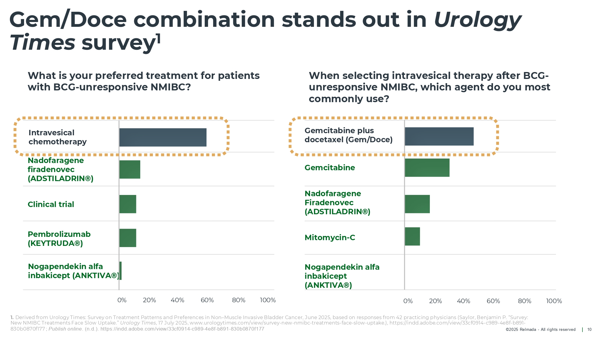 ©2025 Relmada - All rights reserved Gem/Doce combination stands out in Urology Times survey 1 10 What is your preferred treatment for patients with BCG - unresponsive NMIBC? When selecting intravesical therapy after BCG - unresponsive NMIBC, which agent do you most commonly use? 1. Derived from Urology Times: Survey on Treatment Patterns and Preferences in Non – Muscle Invasive Bladder Cancer, June 2025, based on responses from 42 practicing physicians (Saylor, Benjamin P. “Survey: New NMIBC Treatments Face Slow Uptake.” Urology Times , 17 July 2025, www.urologytimes.com/view/survey - new - nmibc - treatments - face - slow - uptake.), https://indd.adobe.com/view/33cf0914 - c989 - 4e8f - b891 - 830b0870f177 ; Publish online . (n.d.). https://indd.adobe.com/view/33cf0914 - c989 - 4e8f - b891 - 830b0870f177 Clinical trial Nogapendekin alfa inbakicept (ANKTIVA®) Pembrolizumab (KEYTRUDA®) Intravesical chemotherapy Mitomycin - C Nogapendekin alfa inbakicept Nadofaragene Firadenovec (ADSTILADRIN®) Gemcitabine plus docetaxel (Gem/Doce) Gemcitabine Nadofaragene firadenovec (ADSTILADRIN®) 0% 20% 40% 60% 80% 100% (ANKTIVA®) 0% 20% 40% 60% 80% 100%