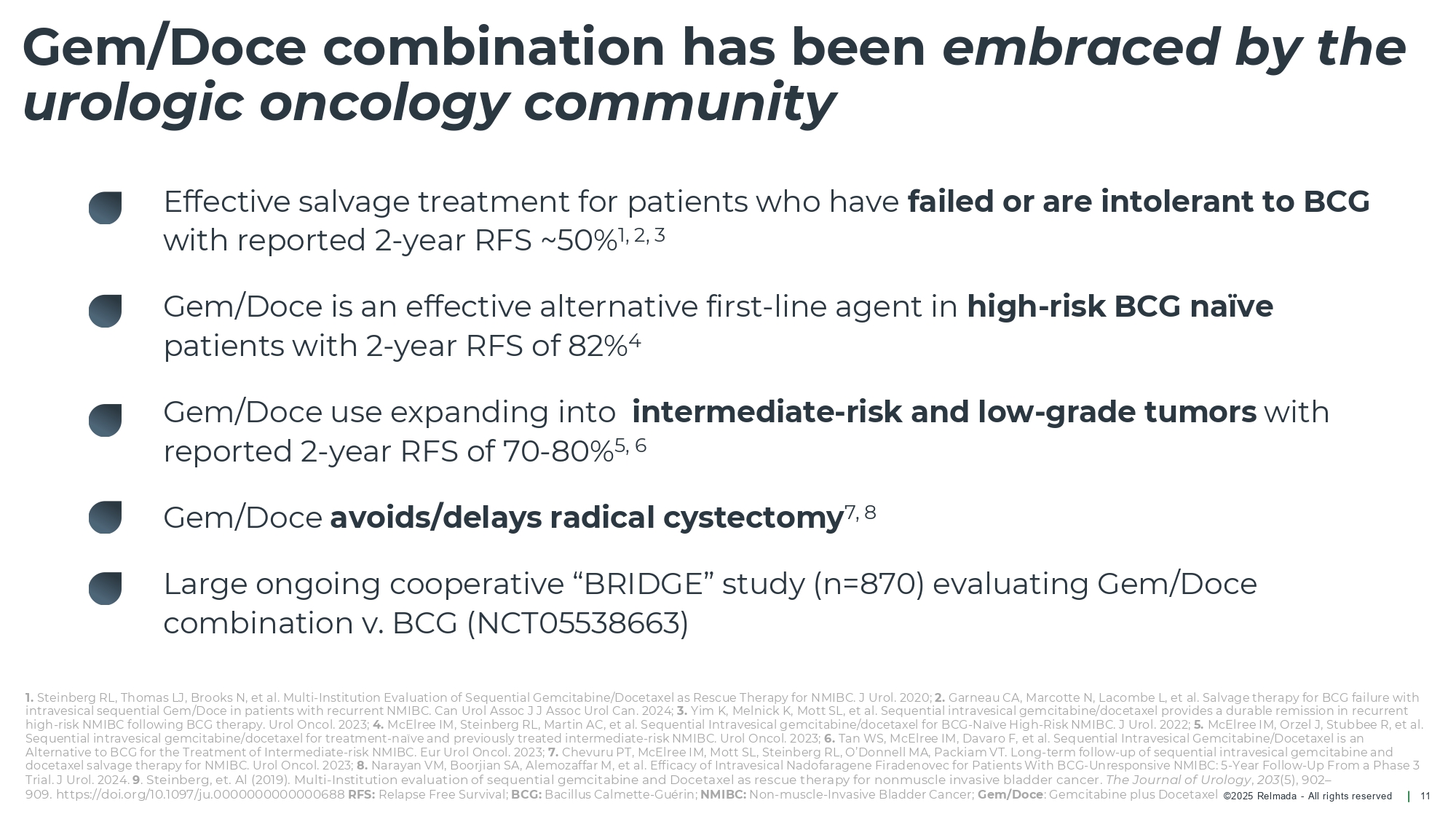 Gem/Doce combination has been embraced by the urologic oncology community 11 Effective salvage treatment for patients who have failed or are intolerant to BCG with reported 2 - year RFS ~50% 1, 2, 3 Gem/Doce is an effective alternative first - line agent in high - risk BCG naïve patients with 2 - year RFS of 82% 4 Gem/Doce use expanding into intermediate - risk and low - grade tumors with reported 2 - year RFS of 70 - 80% 5, 6 Gem/Doce avoids/delays radical cystectomy 7, 8 Large ongoing cooperative “BRIDGE” study (n=870) evaluating Gem/Doce combination v. BCG (NCT05538663) 1. Steinberg RL, Thomas LJ, Brooks N, et al. Multi - Institution Evaluation of Sequential Gemcitabine/Docetaxel as Rescue Therapy for NMIBC. J Urol. 2020; 2. Garneau CA, Marcotte N, Lacombe L, et al. Salvage therapy for BCG failure with intravesical sequential Gem/Doce in patients with recurrent NMIBC. Can Urol Assoc J J Assoc Urol Can. 2024; 3. Yim K, Melnick K, Mott SL, et al. Sequential intravesical gemcitabine/docetaxel provides a durable remission in recurrent high - risk NMIBC following BCG therapy. Urol Oncol. 2023; 4. McElree IM, Steinberg RL, Martin AC, et al. Sequential Intravesical gemcitabine/docetaxel for BCG - Naïve High - Risk NMIBC. J Urol. 2022; 5. McElree IM, Orzel J, Stubbee R, et al. Sequential intravesical gemcitabine/docetaxel for treatment - naïve and previously treated intermediate - risk NMIBC. Urol Oncol. 2023; 6. Tan WS, McElree IM, Davaro F, et al. Sequential Intravesical Gemcitabine/Docetaxel is an Alternative to BCG for the Treatment of Intermediate - risk NMIBC. Eur Urol Oncol. 2023; 7. Chevuru PT, McElree IM, Mott SL, Steinberg RL, O’Donnell MA, Packiam VT. Long - term follow - up of sequential intravesical gemcitabine and docetaxel salvage therapy for NMIBC. Urol Oncol. 2023; 8. Narayan VM, Boorjian SA, Alemozaffar M, et al. Efficacy of Intravesical Nadofaragene Firadenovec for Patients With BCG - Unresponsive NMIBC: 5 - Year Follow - Up From a Phase 3 Trial. J Urol. 2024. 9 . Steinberg, et. Al (2019). Multi - Institution evaluation of sequential gemcitabine and Docetaxel as rescue therapy for nonmuscle invasive bladder cancer. The Journal of Urology , 203 (5), 902 – 909. https://doi.org/10.1097/ju.0000000000000688 RFS: Relapse Free Survival; BCG: Bacillus Calmette - Guérin; NMIBC: Non - muscle - Invasive Bladder Cancer; Gem/Doce : Gemcitabine plus Docetaxel ©2025 Relmada - All rights reserved