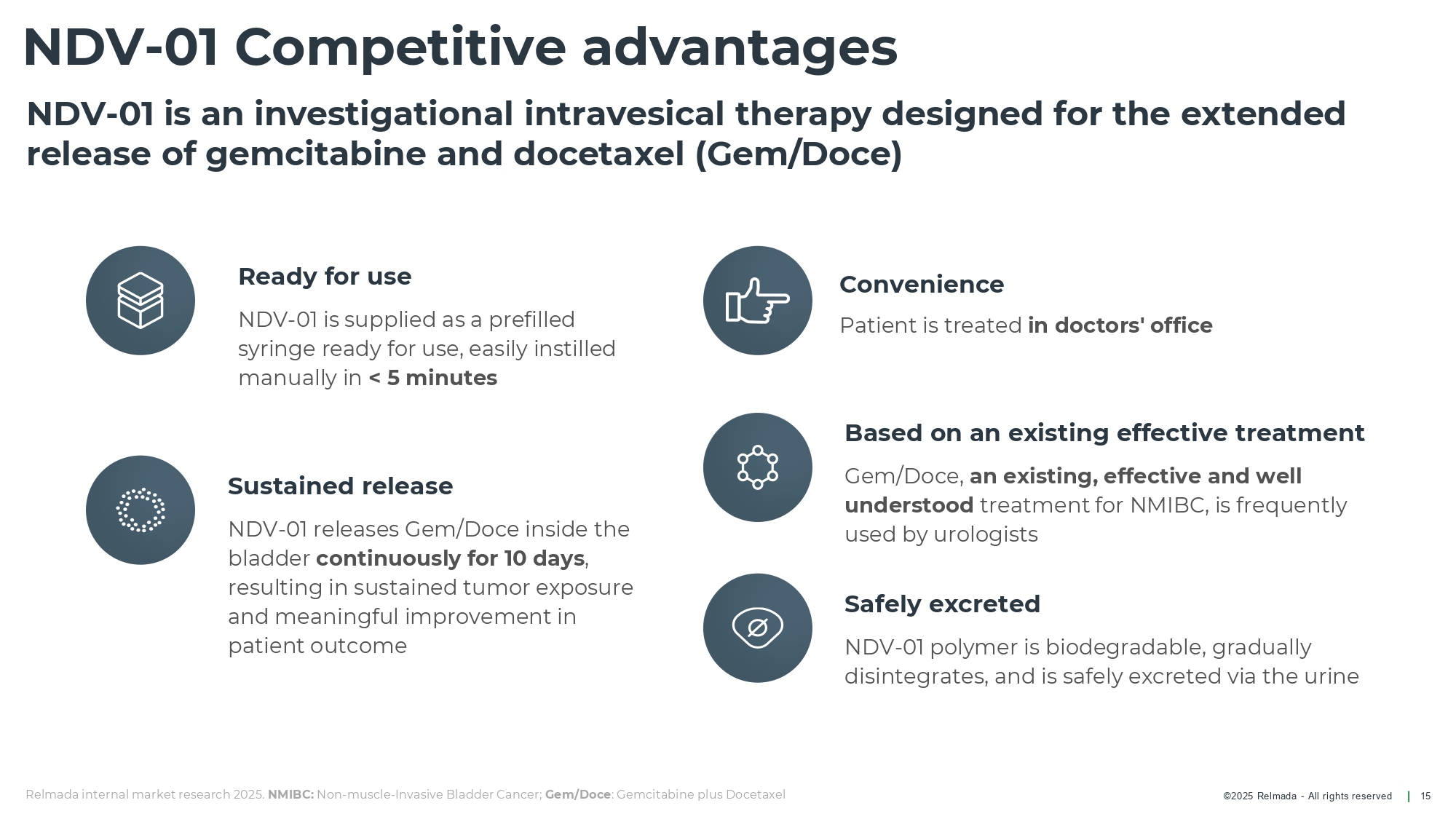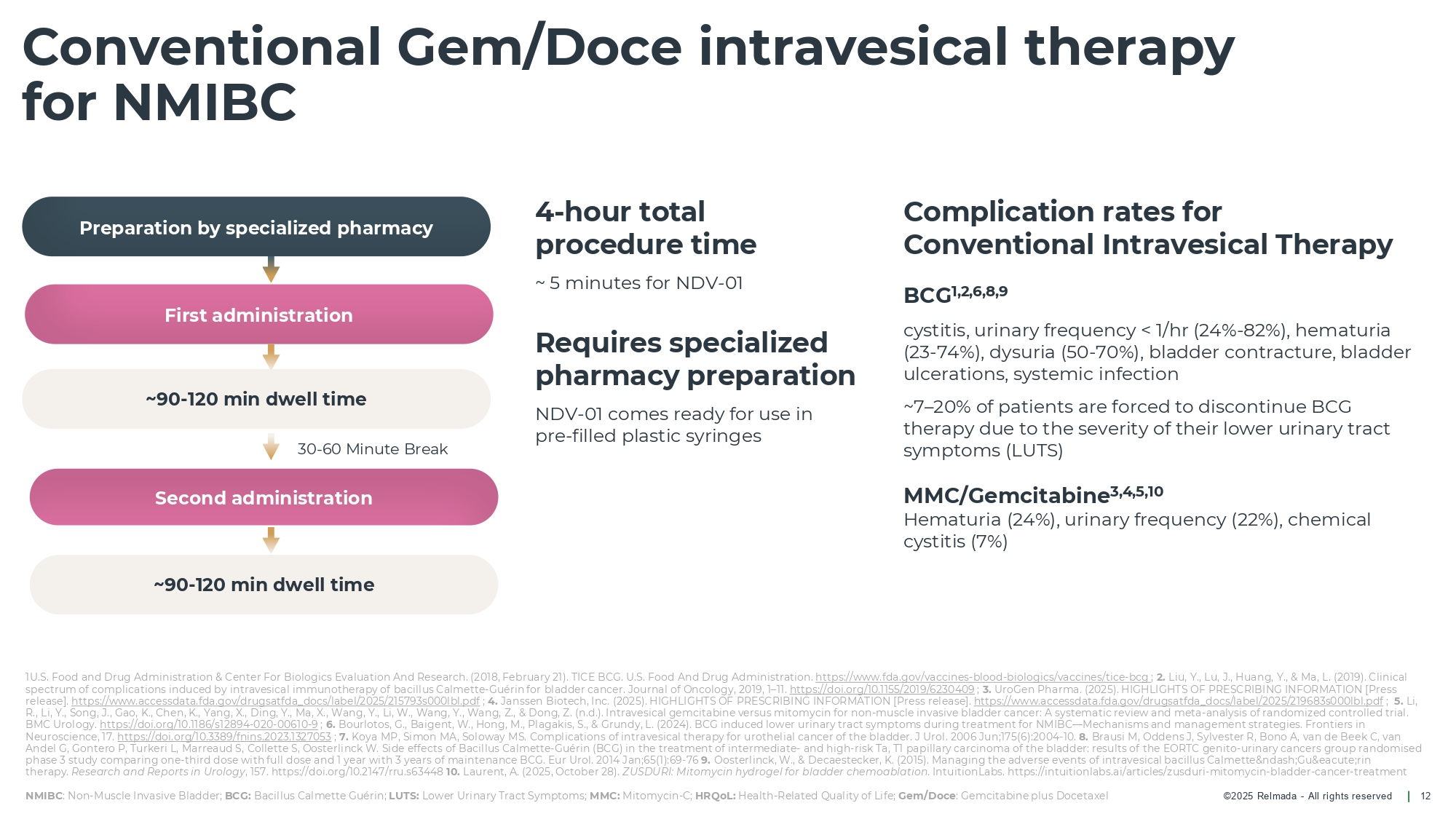 1U.S. Food and Drug Administration & Center For Biologics Evaluation And Research. (2018, February 21). TICE BCG. U.S. Food And Drug Administration. https://www.fda.gov/vaccines - blood - biologics/vaccines/tice - bc g ; 2. Liu, Y., Lu, J., Huang, Y., & Ma, L. (2019). Clinical spectrum of complications induced by intravesical immunotherapy of bacillus Calmette - Guérin for bladder cancer. Journal of Oncology, 2019, 1 – 11. https://doi.org/10.1155/2019/6230409 ; 3. UroGen Pharma. (2025). HIGHLIGHTS OF PRESCRIBING INFORMATION [Press release]. https://www.accessdata.fda.gov/drugsatfda_docs/label/2025/215793s000lbl.pdf ; 4. Janssen Biotech, Inc. (2025). HIGHLIGHTS OF PRESCRIBING INFORMATION [Press release]. https://www.accessdata.fda.gov/drugsatfda_docs/label/2025/219683s000lbl.pdf ; 5. Li, R., Li, Y., Song, J., Gao, K., Chen, K., Yang, X., Ding, Y., Ma, X., Wang, Y., Li, W., Wang, Y., Wang, Z., & Dong, Z. (n.d.). Intravesical gemcitabine versus mitomycin for non - muscle invasive bladder cancer: A systematic review and meta - analysis of randomized controlled trial. BMC Urology. https://doi.org/10.1186/s12894 - 020 - 00610 - 9 ; 6. Bourlotos, G., Baigent, W., Hong, M., Plagakis, S., & Grundy, L. (2024). BCG induced lower urinary tract symptoms during treatment for NMIBC — Mechanisms and management strategies. Frontiers in Neuroscience, 17. https://doi.org/10.3389/fnins.2023.1327053 ; 7. Koya MP, Simon MA, Soloway MS. Complications of intravesical therapy for urothelial cancer of the bladder. J Urol. 2006 Jun;175(6):2004 - 10. 8. Brausi M, Oddens J, Sylvester R, Bono A, van de Beek C, van Andel G, Gontero P, Turkeri L, Marreaud S, Collette S, Oosterlinck W. Side effects of Bacillus Calmette - Guérin (BCG) in the treatment of intermediate - and high - risk Ta, T1 papillary carcinoma of the bladder: results of the EORTC genito - urinary cancers group randomised phase 3 study comparing one - third dose with full dose and 1 year with 3 years of maintenance BCG. Eur Urol. 2014 Jan;65(1):69 - 76 9. Oosterlinck, W., & Decaestecker, K. (2015). Managing the adverse events of intravesical bacillus Calmette–Guérin therapy. Research and Reports in Urology , 157. https://doi.org/10.2147/rru.s63448 10. Laurent, A. (2025, October 28). ZUSDURI: Mitomycin hydrogel for bladder chemoablation . IntuitionLabs. https://intuitionlabs.ai/articles/zusduri - mitomycin - bladder - cancer - treatment NMIBC : Non - Muscle Invasive Bladder; BCG: Bacillus Calmette Guérin; LUTS: Lower Urinary Tract Symptoms; MMC: Mitomycin - C; HRQoL: Health - Related Quality of Life; Gem/Doce : Gemcitabine plus Docetaxel ©2025 Relmada - All rights reserved 12 Conventional Gem/Doce intravesical therapy for NMIBC First administration Preparation by specialized pharmacy ~90 - 120 min dwell time Second administration ~90 - 120 min dwell time 30 - 60 Minute Break 4 - hour total procedure time ~ 5 minutes for NDV - 01 Requires specialized pharmacy preparation NDV - 01 comes ready for use in pre - filled plastic syringes Complication rates for Conventional Intravesical Therapy BCG 1,2,6,8,9 cystitis, urinary frequency < 1/hr (24% - 82%), hematuria (23 - 74%), dysuria (50 - 70%), bladder contracture, bladder ulcerations, systemic infection ~7 – 20% of patients are forced to discontinue BCG therapy due to the severity of their lower urinary tract symptoms (LUTS) MMC/Gemcitabine 3,4,5,10 Hematuria (24%), urinary frequency (22%), chemical cystitis (7%)
