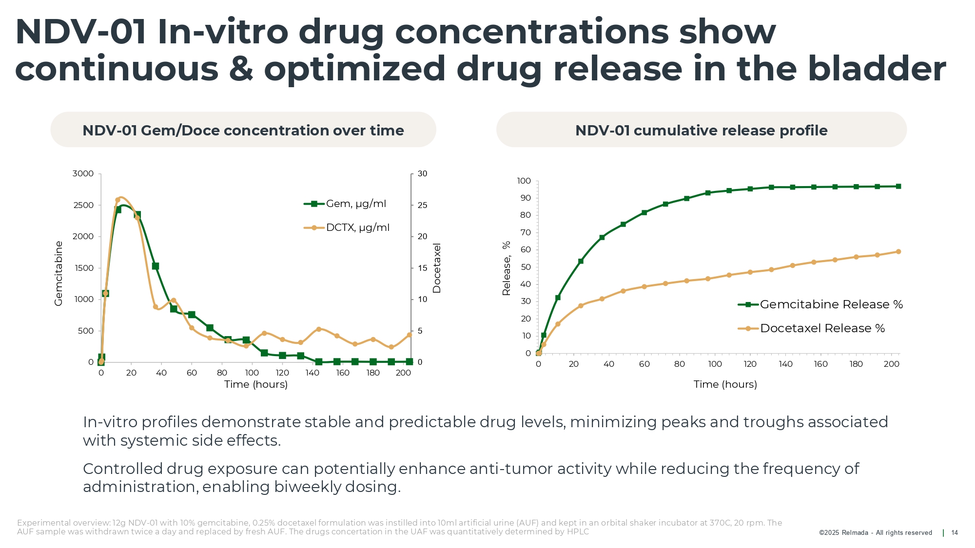 ©2025 Relmada - All rights reserved NDV - 01 In - vitro drug concentrations show continuous & optimized drug release in the bladder 14 In - vitro profiles demonstrate stable and predictable drug levels, minimizing peaks and troughs associated with systemic side effects. Controlled drug exposure can potentially enhance anti - tumor activity while reducing the frequency of administration, enabling biweekly dosing. 100 90 80 70 60 50 40 30 20 10 0 0 20 40 60 80 100 120 Time (hours) 140 160 180 200 Release, % Gemcitabine Release % Docetaxel Release % 0 5 10 15 20 25 30 0 500 1000 1500 2000 2500 3000 0 20 40 60 80 100 120 140 160 180 200 Time (hours) Docetaxel Gemcitabine Gem, µg/ml DCTX, µg/ml NDV - 01 Gem/Doce concentration over time NDV - 01 cumulative release profile Experimental overview: 12g NDV - 01 with 10% gemcitabine, 0.25% docetaxel formulation was instilled into 10ml artificial urine (AUF) and kept in an orbital shaker incubator at 370C, 20 rpm. The AUF sample was withdrawn twice a day and replaced by fresh AUF. The drugs concertation in the UAF was quantitatively determined by HPLC