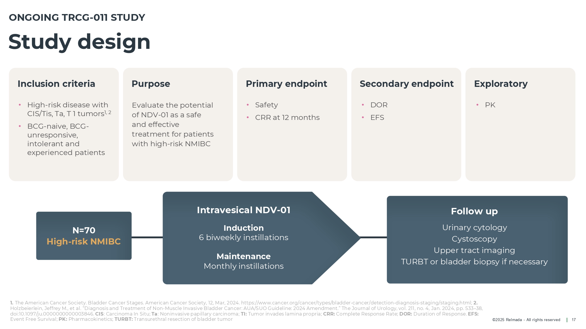 ©2025 Relmada - All rights reserved 16 Study TRCG - 011 high - risk NMIBC patients An open - label, single - arm, single - center study to evaluate safety and efficacy of NDV - 01 in HR NMIBC patients (NCT06663137) HR: High Risk; NMIBC: Non muscle invasive bladder cancer