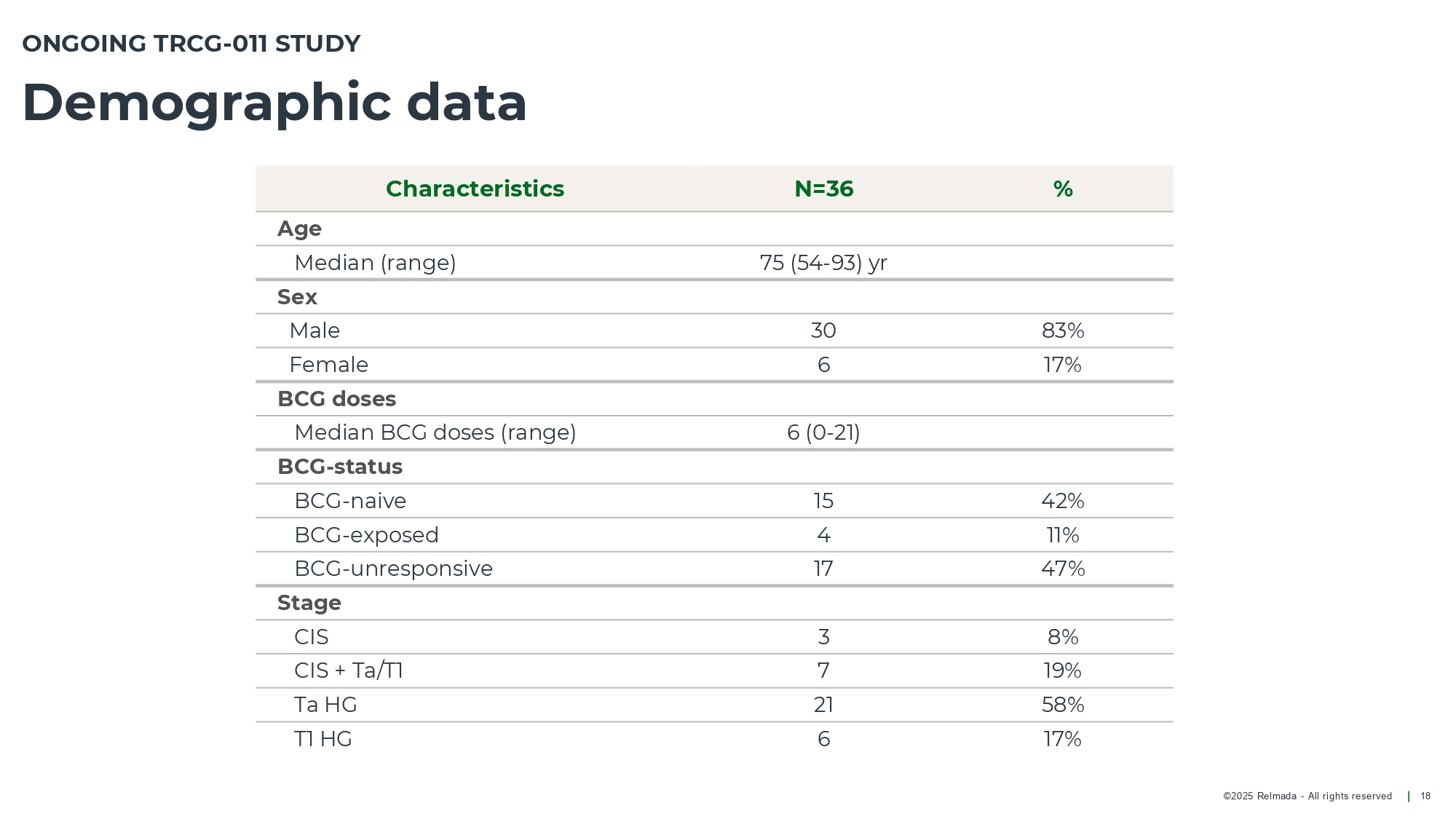 ©2025 Relmada - All rights reserved Inclusion criteria Purpose Primary endpoint Secondary endpoint Exploratory Study design 17 N=70 High - risk NMIBC • High - risk disease with CIS/Tis, Ta, T 1 tumors 1, 2 • BCG - naive, BCG - unresponsive, intolerant and experienced patients Evaluate the potential of NDV - 01 as a safe and effective treatment for patients with high - risk NMIBC • Safety • CRR at 12 months • DOR • EFS • PK ONGOING TRCG - 011 STUDY Follow up Urinary cytology Cystoscopy Upper tract imaging TURBT or bladder biopsy if necessary Intravesical NDV - 01 Induction 6 biweekly instillations Maintenance Monthly instillations 1. The American Cancer Society. Bladder Cancer Stages. American Cancer Society, 12, Mar, 2024. https:// www.cancer.org/cancer/types/bladder - cancer/detection - diagnosis - staging/staging.html; 2. Holzbeierlein, Jeffrey M., et al. “Diagnosis and Treatment of Non - Muscle Invasive Bladder Cancer: AUA/SUO Guideline: 2024 Amendment.” The Journal of Urology, vol. 211, no. 4, Jan. 2024, pp. 533 – 38, doi:10.1097/ju.0000000000003846. CIS : Carcinoma In Situ; Ta : Noninvasive papillary carcinoma; TI: Tumor invades lamina propria; CRR: Complete Response Rate; DOR: Duration of Response. EFS: Event Free Survival; PK: Pharmacokinetics; TURBT: Transurethral resection of bladder tumor