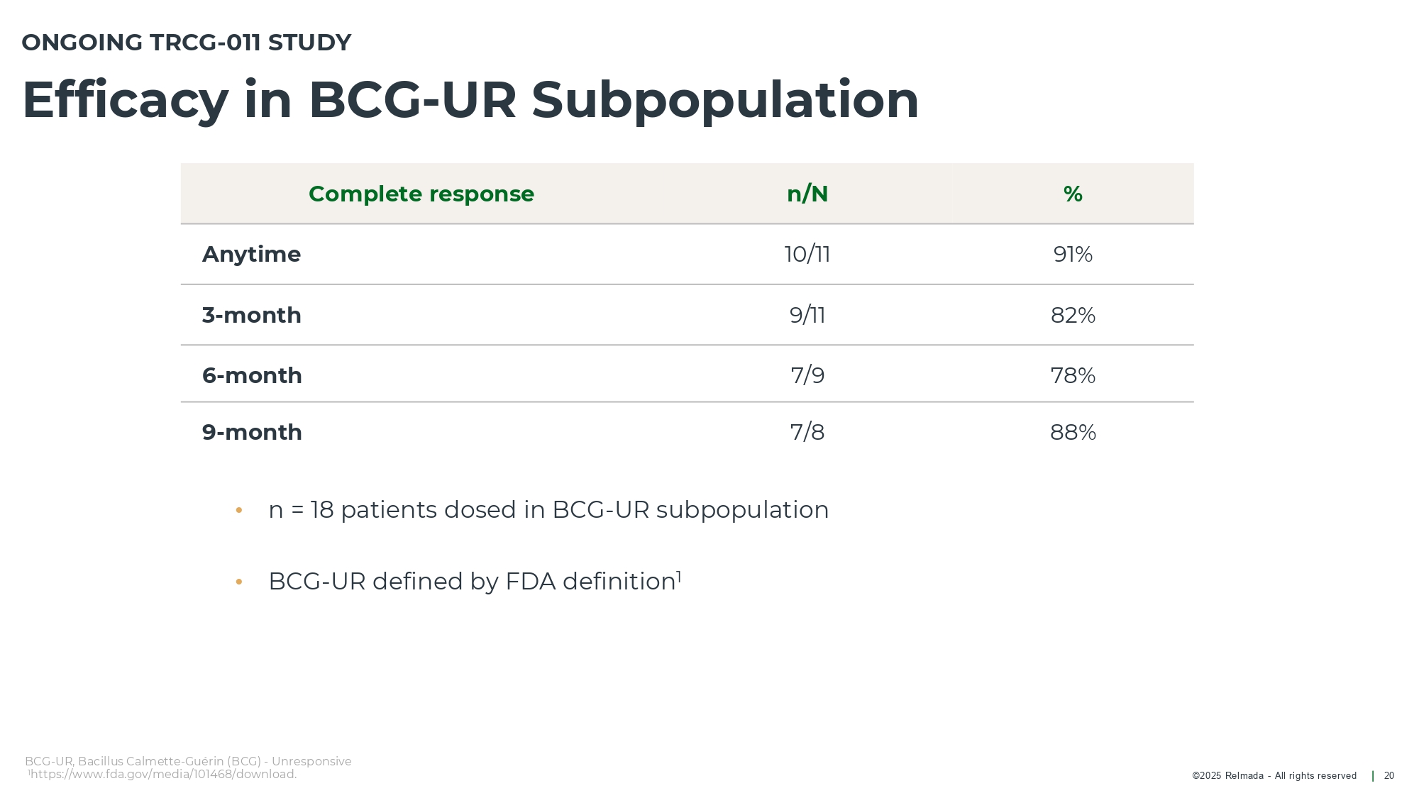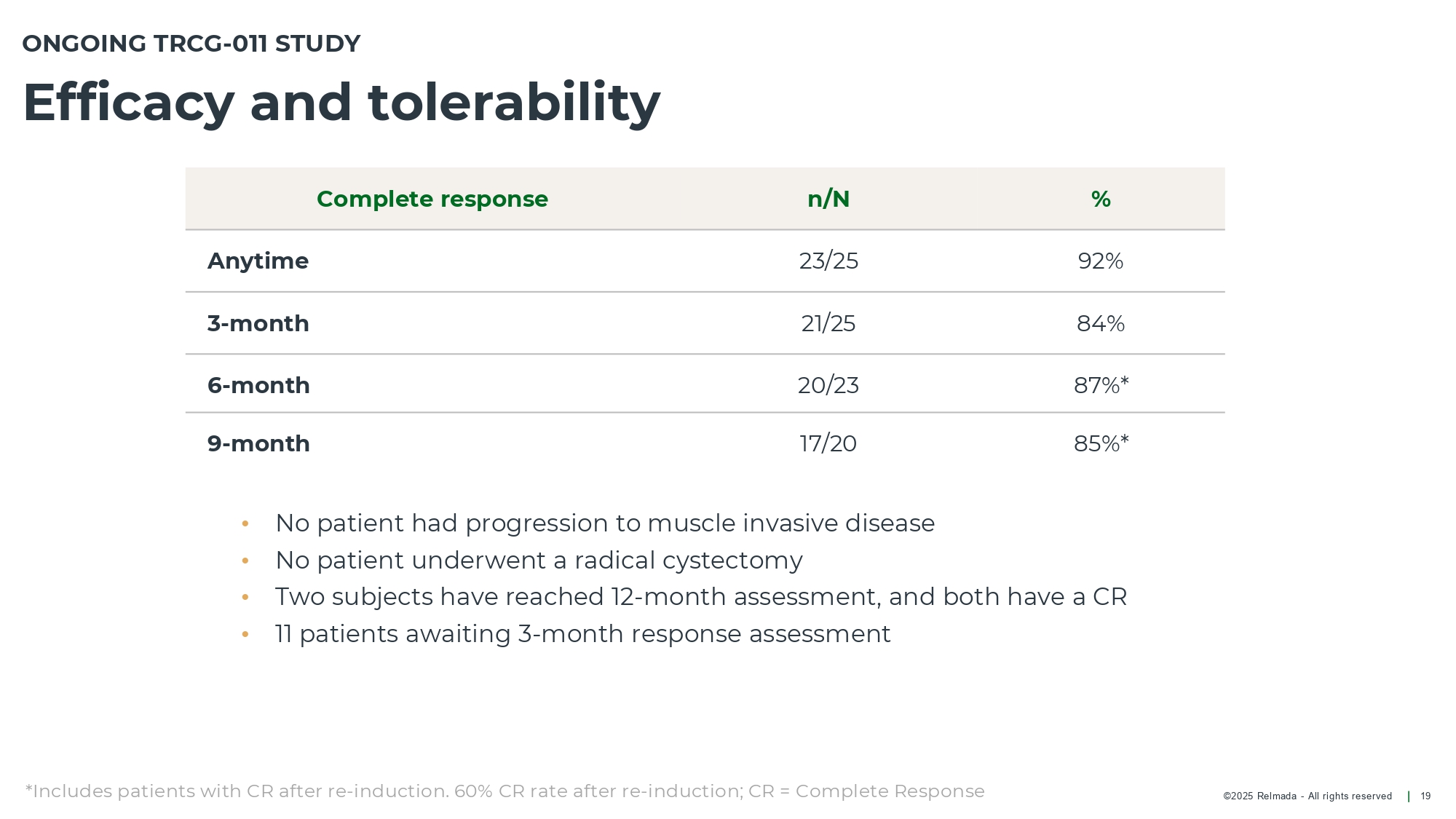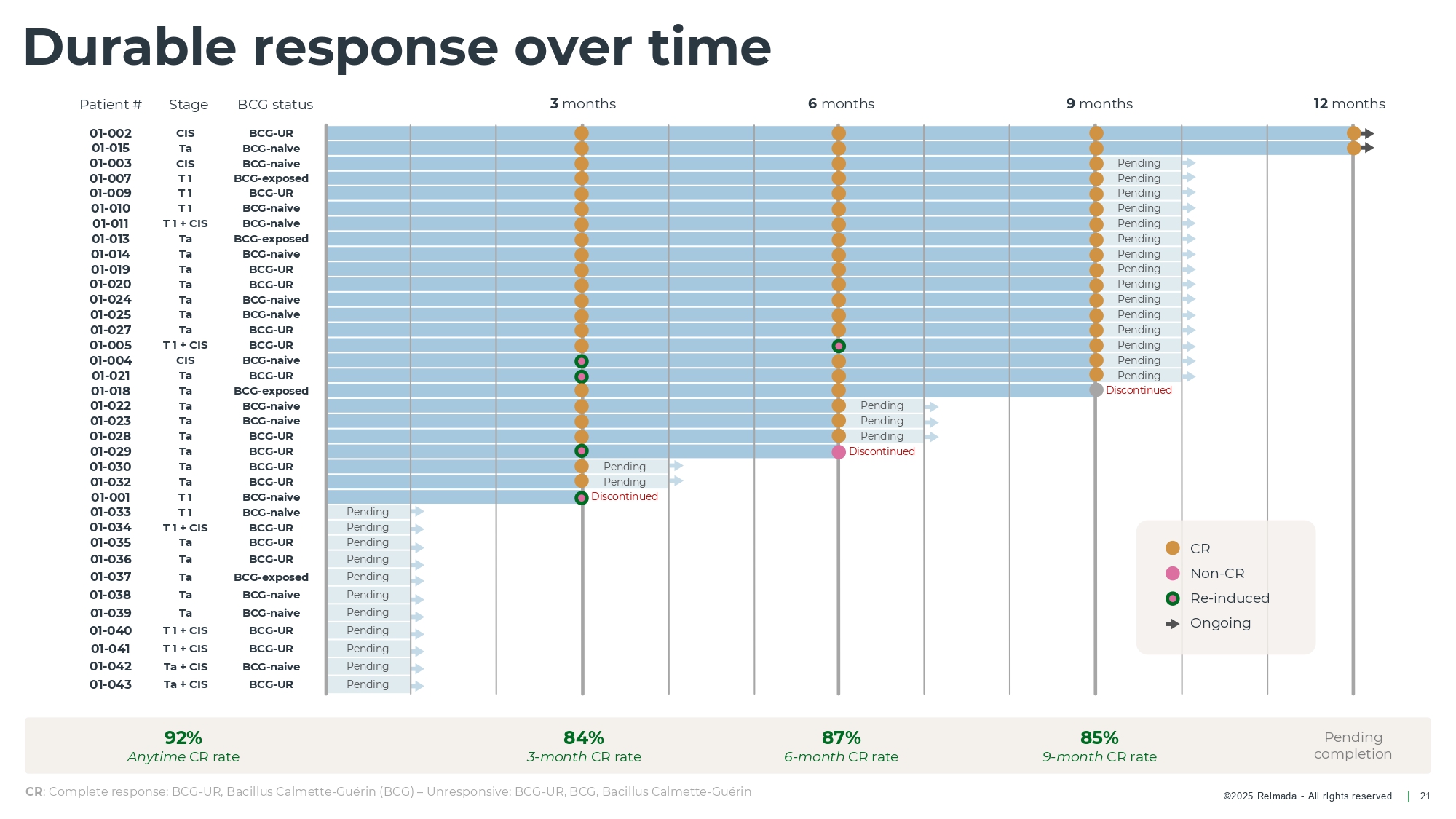 ©2025 Relmada - All rights reserved 01 - 002 01 - 015 Pending 01 - 003 01 - 007 Pending Pending 01 - 009 01 - 010 Pending Pending 01 - 011 01 - 013 Pending Pending 01 - 014 01 - 019 Pending Pending 01 - 020 01 - 024 Pending Pending 01 - 025 01 - 027 Pending Pending 01 - 005 01 - 004 Pending Pending 01 - 021 01 - 018 Discontinued Pending 01 - 022 01 - 023 Pending Pending 01 - 028 01 - 029 Discontinued Pending 01 - 030 01 - 032 Pending Discontinued 01 - 001 01 - 033 Pending Pending 01 - 034 01 - 035 Pending 01 - 036 Pending 01 - 037 Pending 01 - 038 Pending 01 - 039 Pending 01 - 040 Pending 01 - 041 Pending 01 - 042 Pending 01 - 043 CIS BCG - UR Ta BCG - naive CIS BCG - naive T 1 BCG - exposed T 1 BCG - UR T 1 BCG - naive T 1 + CIS BCG - naive Ta BCG - exposed Ta BCG - naive Ta BCG - UR Ta BCG - UR Ta BCG - naive Ta BCG - naive Ta BCG - UR T 1 + CIS BCG - UR CIS BCG - naive Ta BCG - UR Ta BCG - exposed Ta BCG - naive Ta BCG - naive Ta BCG - UR Ta BCG - UR Ta BCG - UR Ta BCG - UR T 1 BCG - naive T 1 BCG - naive T 1 + CIS BCG - UR Ta BCG - UR Ta BCG - UR Ta BCG - exposed Ta BCG - naive Ta BCG - naive T 1 + CIS BCG - UR T 1 + CIS BCG - UR Ta + CIS BCG - naive Ta + CIS BCG - UR Pending Patient # Stage BCG status 3 months 6 months 9 months 12 months Durable response over time 21 CR : Complete response; BCG - UR, Bacillus Calmette - Guérin (BCG) – Unresponsive; BCG - UR, BCG, Bacillus Calmette - Guérin 92% Anytime CR rate 84% 3 - month CR rate 87% 6 - month CR rate Pending completion 85% 9 - month CR rate CR Non - CR Re - induced Ongoing