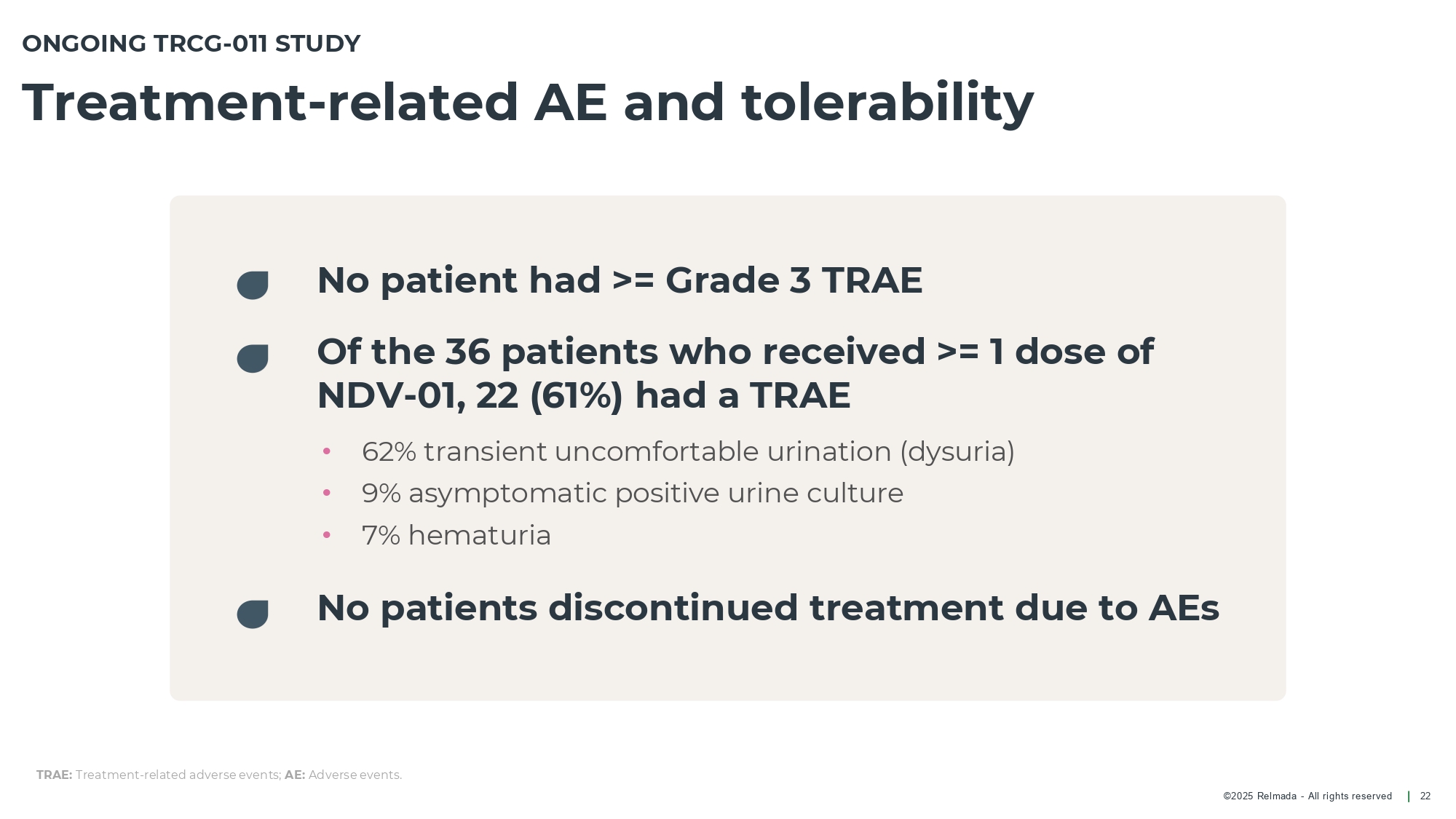 ©2025 Relmada - All rights reserved Grade n (%) AE 1 22 (61%) Dysuria 1 3 (9%) Positive urine culture 1/2 3 (7%) Hematuria 1 2 (6%) Abdominal Pain 1 1 (3%) Urgency 1 1 (3%) Frequency 1 1 (3%) UTI 1 1 (3%) Cough NDV - 01 - Study TRCG - 011 - Adverse Events AE, adverse event.
