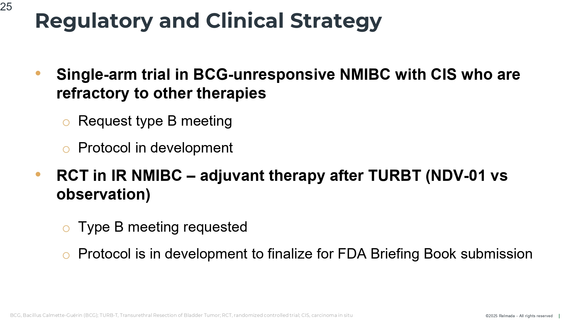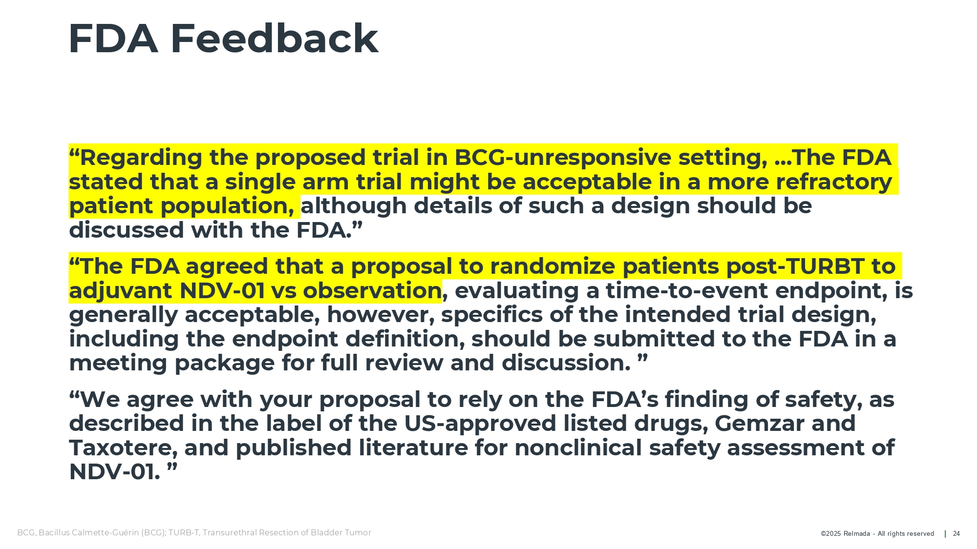 ©2025 Relmada - All rights reserved FDA Feedback “Regarding the proposed trial in BCG - unresponsive setting, …The FDA stated that a single arm trial might be acceptable in a more refractory patient population, although details of such a design should be discussed with the FDA.” “The FDA agreed that a proposal to randomize patients post - TURBT to adjuvant NDV - 01 vs observation , evaluating a time - to - event endpoint, is generally acceptable, however, specifics of the intended trial design, including the endpoint definition, should be submitted to the FDA in a meeting package for full review and discussion. ” “We agree with your proposal to rely on the FDA’s finding of safety, as described in the label of the US - approved listed drugs, Gemzar and Taxotere, and published literature for nonclinical safety assessment of NDV - 01. ” 24 BCG, Bacillus Calmette - Guérin (BCG); TURB - T, Transurethral Resection of Bladder Tumor