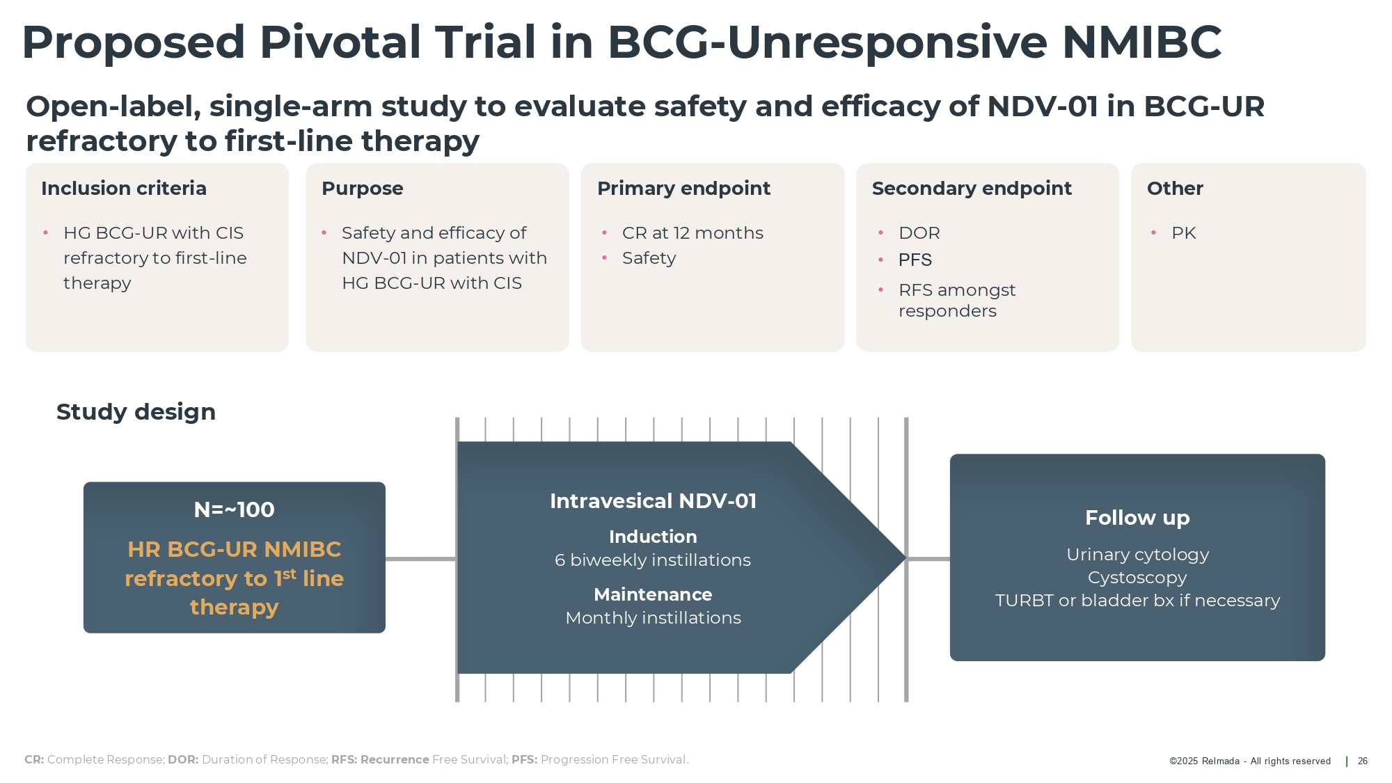 ©2025 Relmada - All rights reserved Regulatory and Clinical Strategy 25 • Single - arm trial in BCG - unresponsive NMIBC with CIS who are refractory to other therapies o Request type B meeting o Protocol in development • RCT in IR NMIBC – adjuvant therapy after TURBT (NDV - 01 vs observation) o Type B meeting requested o Protocol is in development to finalize for FDA Briefing Book submission BCG, Bacillus Calmette - Guérin (BCG); TURB - T, Transurethral Resection of Bladder Tumor; RCT, randomized controlled trial; CIS, carcinoma in situ