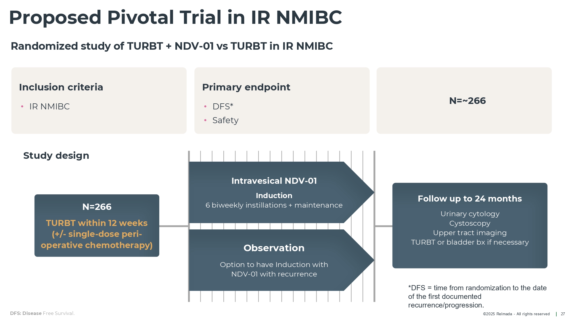 ©2025 Relmada - All rights reserved Proposed Pivotal Trial in BCG - Unresponsive NMIBC 26 • HG BCG - UR with CIS refractory to first - line therapy • Safety and efficacy of NDV - 01 in patients with HG BCG - UR with CIS Intravesical NDV - 01 Induction 6 biweekly instillations Maintenance Monthly instillations Follow up Urinary cytology Cystoscopy TURBT or bladder bx if necessary CR: Complete Response; DOR: Duration of Response; RFS: Recurrence Free Survival; PFS: Progression Free Survival. N=~100 HR BCG - UR NMIBC refractory to 1 st line therapy Study design Open - label, single - arm study to evaluate safety and efficacy of NDV - 01 in BCG - UR refractory to first - line therapy Inclusion criteria Purpose Primary endpoint Secondary endpoint Other • CR at 12 months • Safety • DOR • PFS • RFS amongst responders • PK