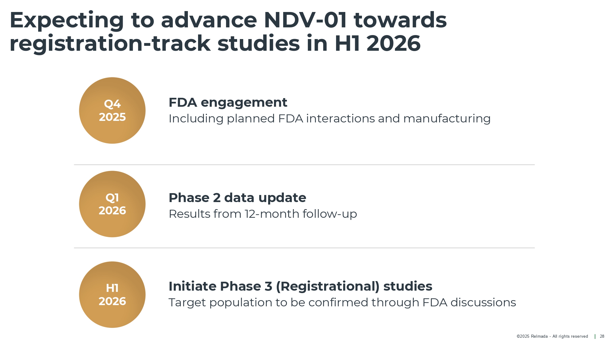 ©2025 Relmada - All rights reserved Expecting to advance NDV - 01 towards registration - track studies in H1 2026 28 FDA engagement Including planned FDA interactions and manufacturing Initiate Phase 3 (Registrational) studies Target population to be confirmed through FDA discussions Phase 2 data update Results from 12 - month follow - up Q4 2025 Q1 2026 H1 2026