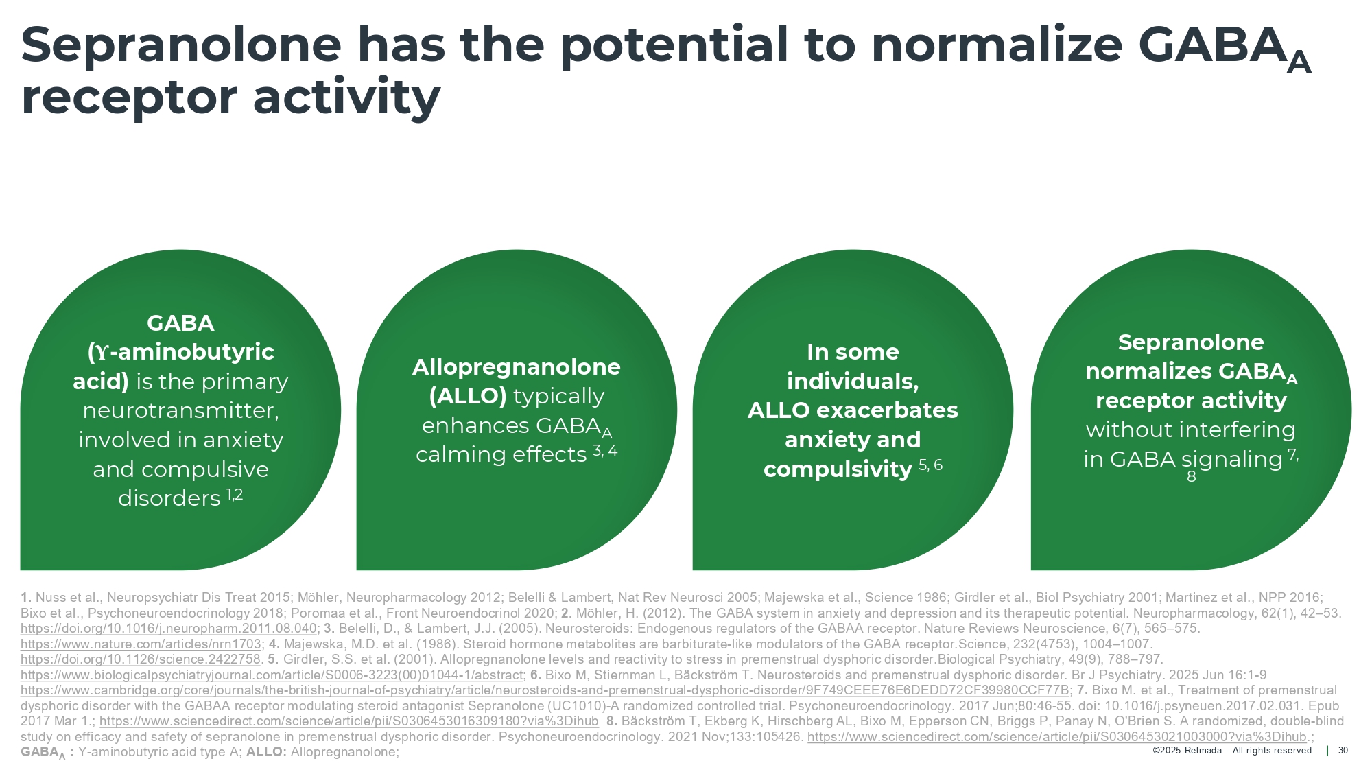 ©2025 Relmada - All rights reserved 30 Sepranolone has the potential to normalize GABA A receptor activity GABA ( Υ - aminobutyric acid) is the primary neurotransmitter, involved in anxiety and compulsive disorders 1,2 Allopregnanolone (ALLO) typically enhances GABA A calming effects 3, 4 In some individuals, ALLO exacerbates anxiety and compulsivity 5, 6 Sepranolone normalizes GABA A receptor activity without interfering in GABA signaling 7, 8 1. Nuss et al., Neuropsychiatr Dis Treat 2015; Möhler, Neuropharmacology 2012; Belelli & Lambert, Nat Rev Neurosci 2005; Majewska et al., Science 1986; Girdler et al., Biol Psychiatry 2001; Martinez et al., NPP 2016; Bixo et al., Psychoneuroendocrinology 2018; Poromaa et al., Front Neuroendocrinol 2020; 2. Möhler, H. (2012). The GABA system in anxiety and depression and its therapeutic potential. Neuropharmacology, 62(1), 42 – 53. https://doi.org/10.1016/j.neuropharm.2011.08.040 ; 3. Belelli, D., & Lambert, J.J. (2005). Neurosteroids: Endogenous regulators of the GABAA receptor. Nature Reviews Neuroscience, 6(7), 565 – 575. https://www.nature.com/articles/nrn1703 ; 4. Majewska, M.D. et al. (1986). Steroid hormone metabolites are barbiturate - like modulators of the GABA receptor.Science, 232(4753), 1004 – 1007. https://doi.org/10.1126/science.2422758 . 5. Girdler, S.S. et al. (2001). Allopregnanolone levels and reactivity to stress in premenstrual dysphoric disorder.Biological Psychiatry, 49(9), 788 – 797. https://www.biologicalpsychiatryjournal.com/article/S0006 - 3223(00)01044 - 1/abstract ; 6. Bixo M, Stiernman L, Bäckström T. Neurosteroids and premenstrual dysphoric disorder. Br J Psychiatry. 2025 Jun 16:1 - 9 https://www.cambridge.org/core/journals/the - british - journa l - of - psychiatry/article/neurosteroids - and - premenstrual - dysphoric - disorder/9F749CEEE76E6DEDD72CF39980CCF77B ; 7. Bixo M. et al., Treatment of premenstrual dysphoric disorder with the GABAA receptor modulating steroid antagonist Sepranolone (UC1010) - A randomized controlled trial. Psychoneuroendocrinology. 2017 Jun;80:46 - 55. doi: 10.1016/j.psyneuen.2017.02.031. Epub 2017 Mar 1.; https://www.sciencedirect.com/science/article/pii/S0306453016309180?via%3Dihub 8. Bäckström T, Ekberg K, Hirschberg AL, Bixo M, Epperson CN, Briggs P, Panay N, O'Brien S. A randomized, double - blind study on efficacy and safety of sepranolone in premenstrual dysphoric disorder. Psychoneuroendocrinology. 2021 Nov;133:105426. https://www.sciencedirect.com/science/article/pii/S0306453021003000?via%3Dihub .; GABA A : Υ - aminobutyric acid type A; ALLO: Allopregnanolone;